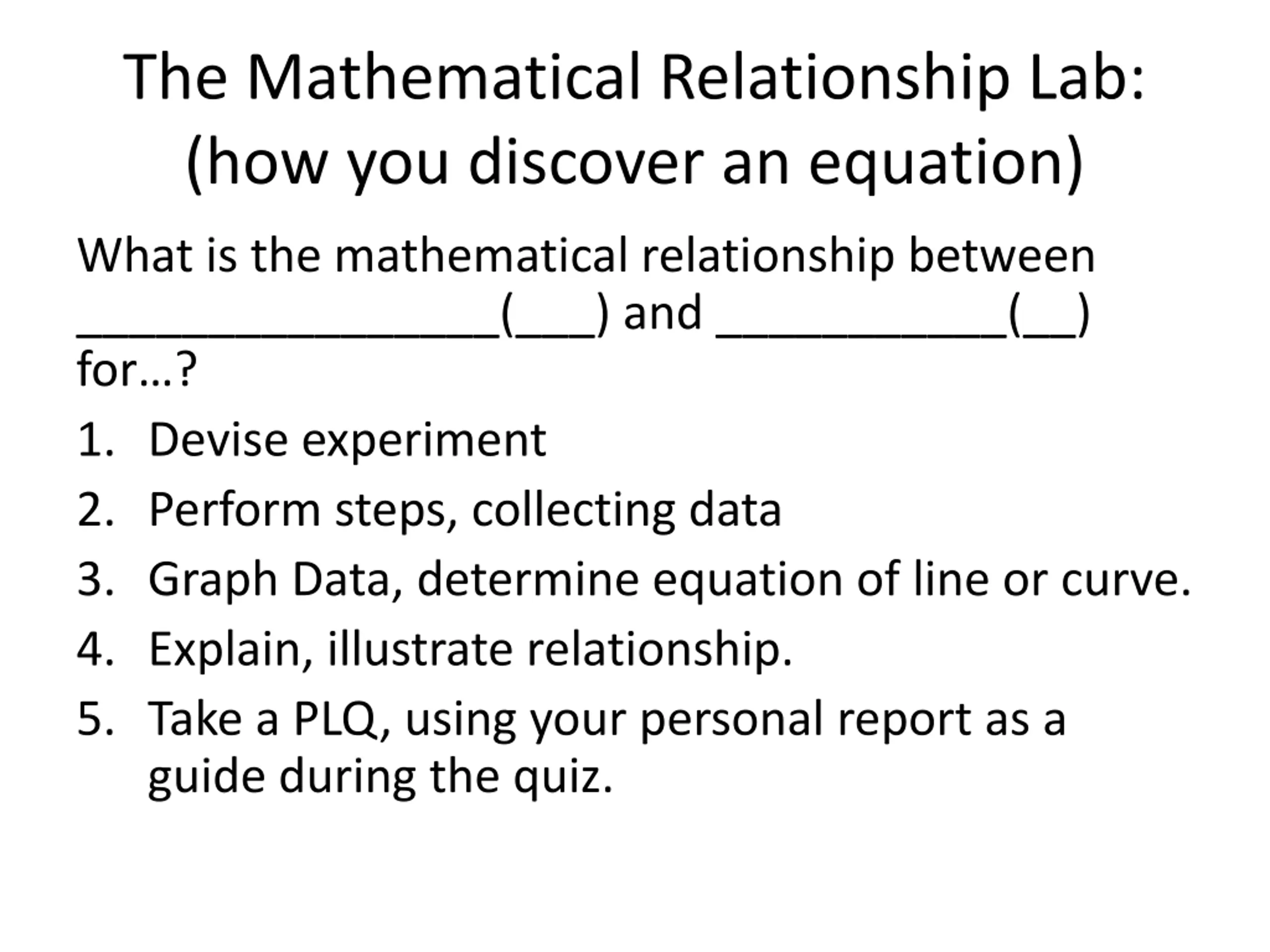 The Mathematical Relationship Lab: (how you discover an equation) What is the mathematical relationship between ________________(___) and ___________(__) for ? 1. Devise experiment 2. Perform steps, collecting data 3. Graph Data, determine equation of line or curve. 4. Explain, illustrate relationship. 5. Take a PLQ, using your personal report as a guide during the quiz.