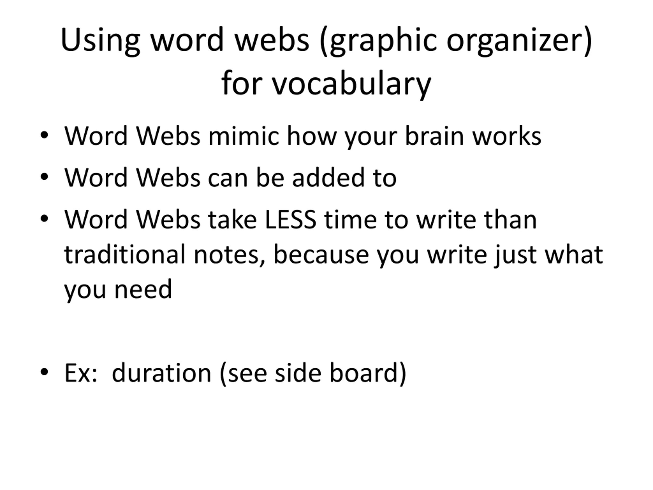 Using word webs (graphic organizer) for vocabulary Word Webs mimic how your brain works Word Webs can be added to Word Webs take LESS time to write than traditional notes, because you write just what you need Ex: duration (see side board)