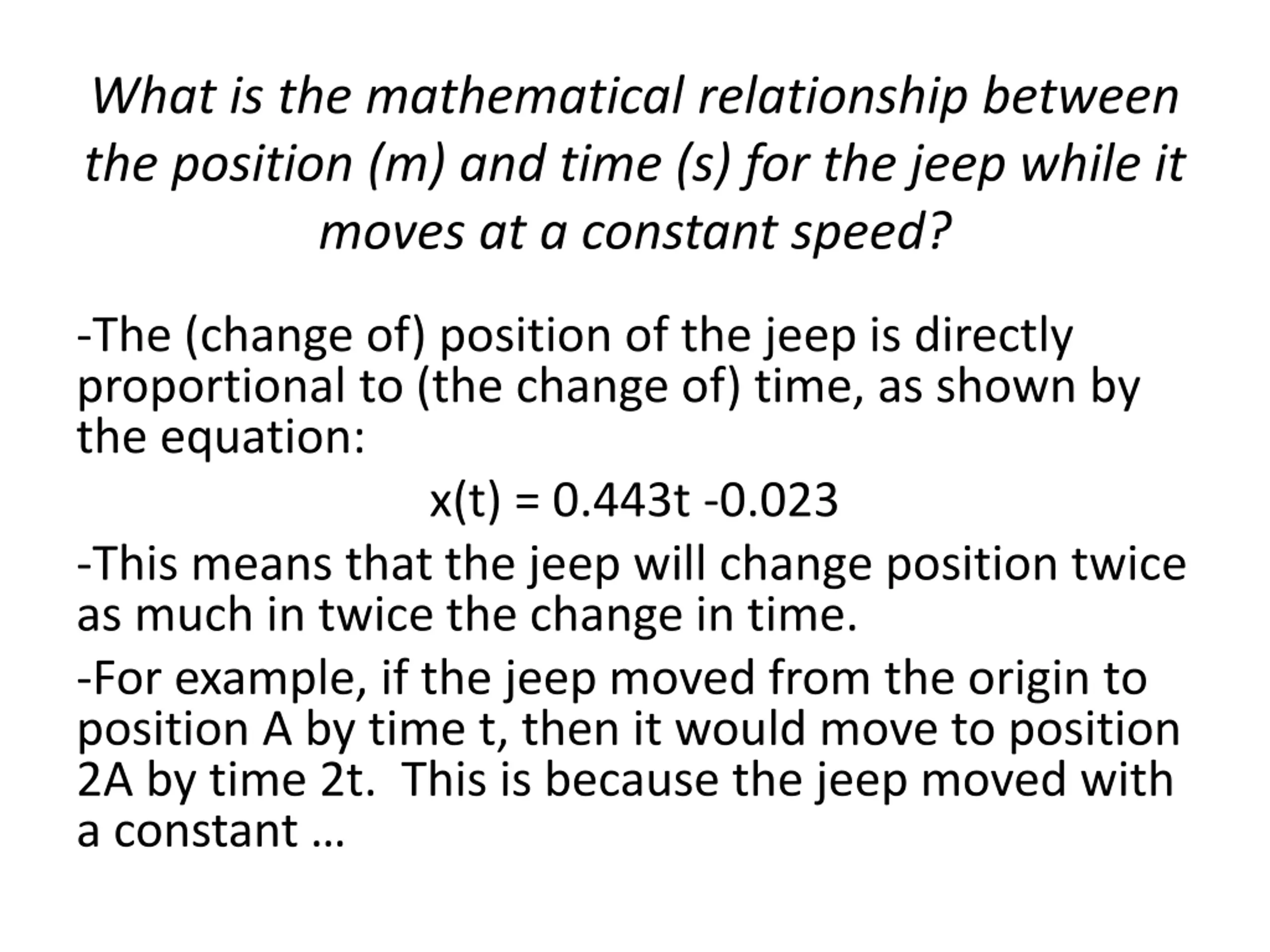 What is the mathematical relationship between the position (m) and time (s) for the jeep while it moves at a constant speed? -The (change of) position of the jeep is directly proportional to (the change of) time, as shown by the equation: x(t) = 0.443t -0.023 -This means that the jeep will change position twice as much in twice the change in time. -For example, if the jeep moved from the origin to position A by time t, then it would move to position 2A by time 2t. This is because the jeep moved with a constant
