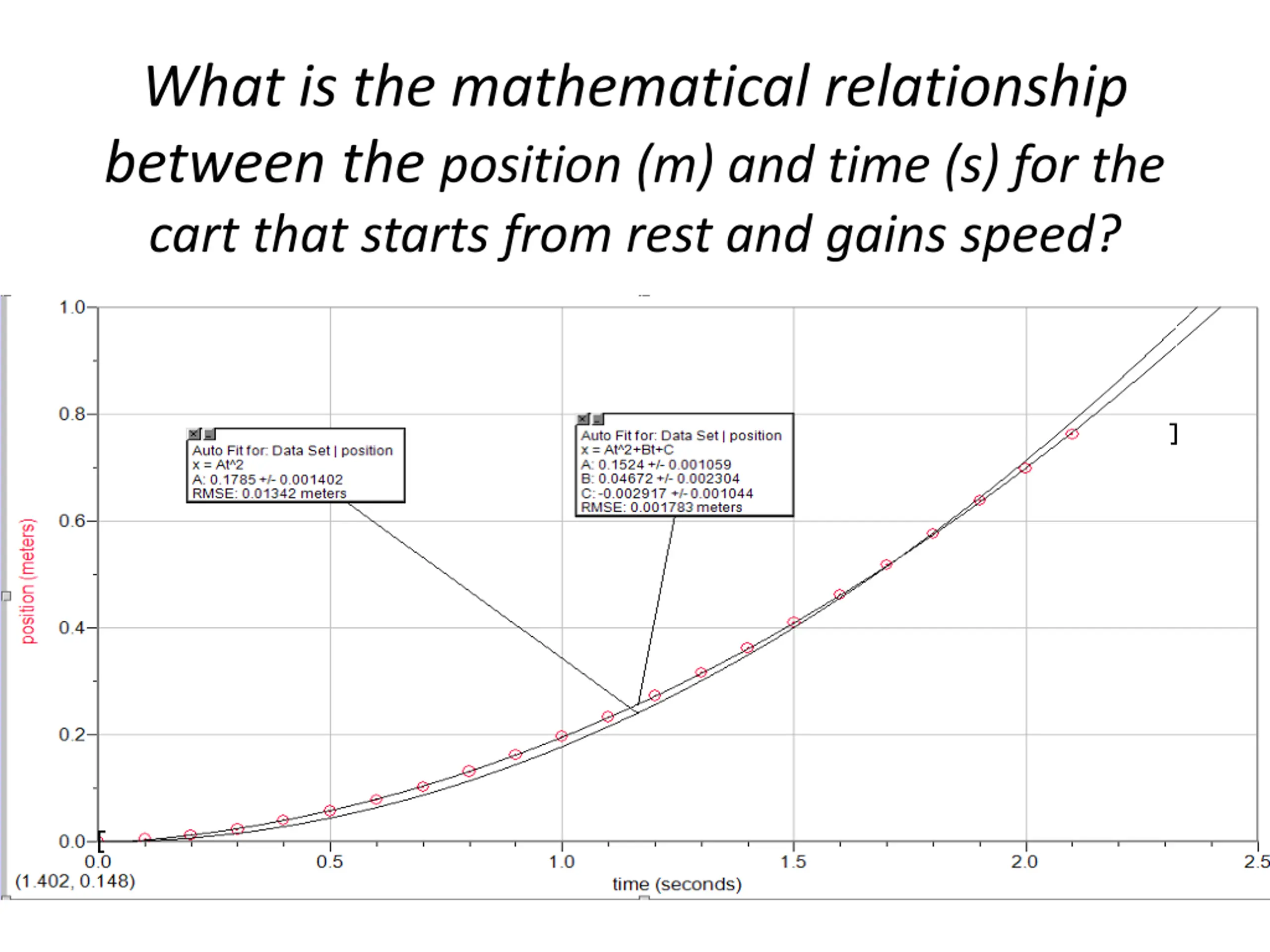 What is the mathematical relationship between the position (m) and time (s) for the cart that starts from rest and gains speed? -The (change of) position of the cart is exponentially proportional to (the change of) time (with an exponent of 2), as shown by the equation: x(t) = 0.1524t2+ 0.04627t -0.002917 -This means that the cart will change position four times as much in twice the change in time (if it starts from rest). -For example, if the cart moved from the origin to position A by time t, then it would move to position 4A by time 2t. This is because the cart .