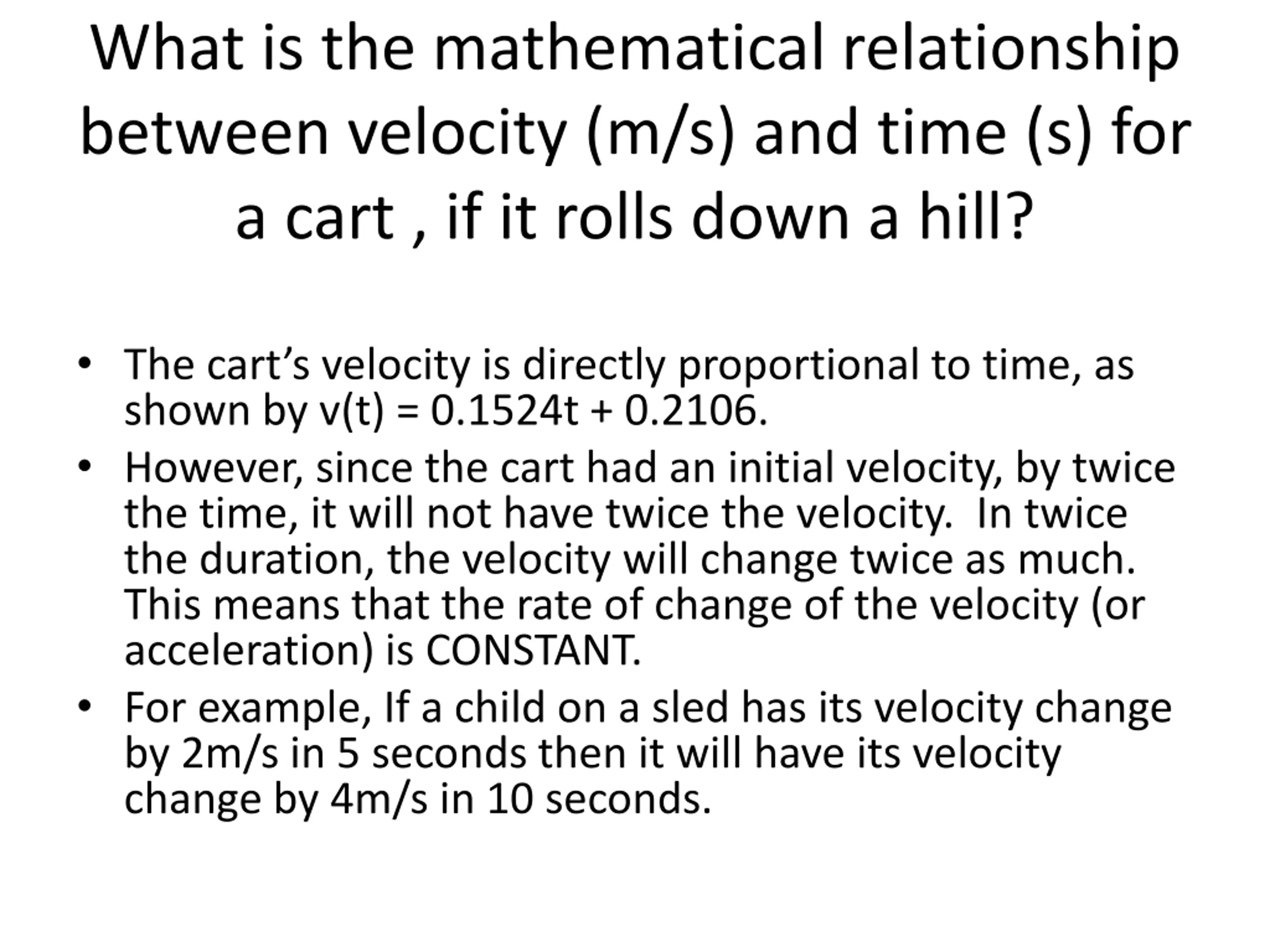 What is the mathematical relationship between velocity (m/s) and time (s) for a cart , if it rolls down a hill? The cart s velocity is directly proportional to time, as shown by v(t) = 0.1524t + 0.2106. However, since the cart had an initial velocity, by twice the time, it will not have twice the velocity. In twice the duration, the velocity will change twice as much. This means that the rate of change of the velocity (or acceleration) is CONSTANT. For example, If a child on a sled has its velocity change by 2m/s in 5 seconds then it will have its velocity change by 4m/s in 10 seconds.