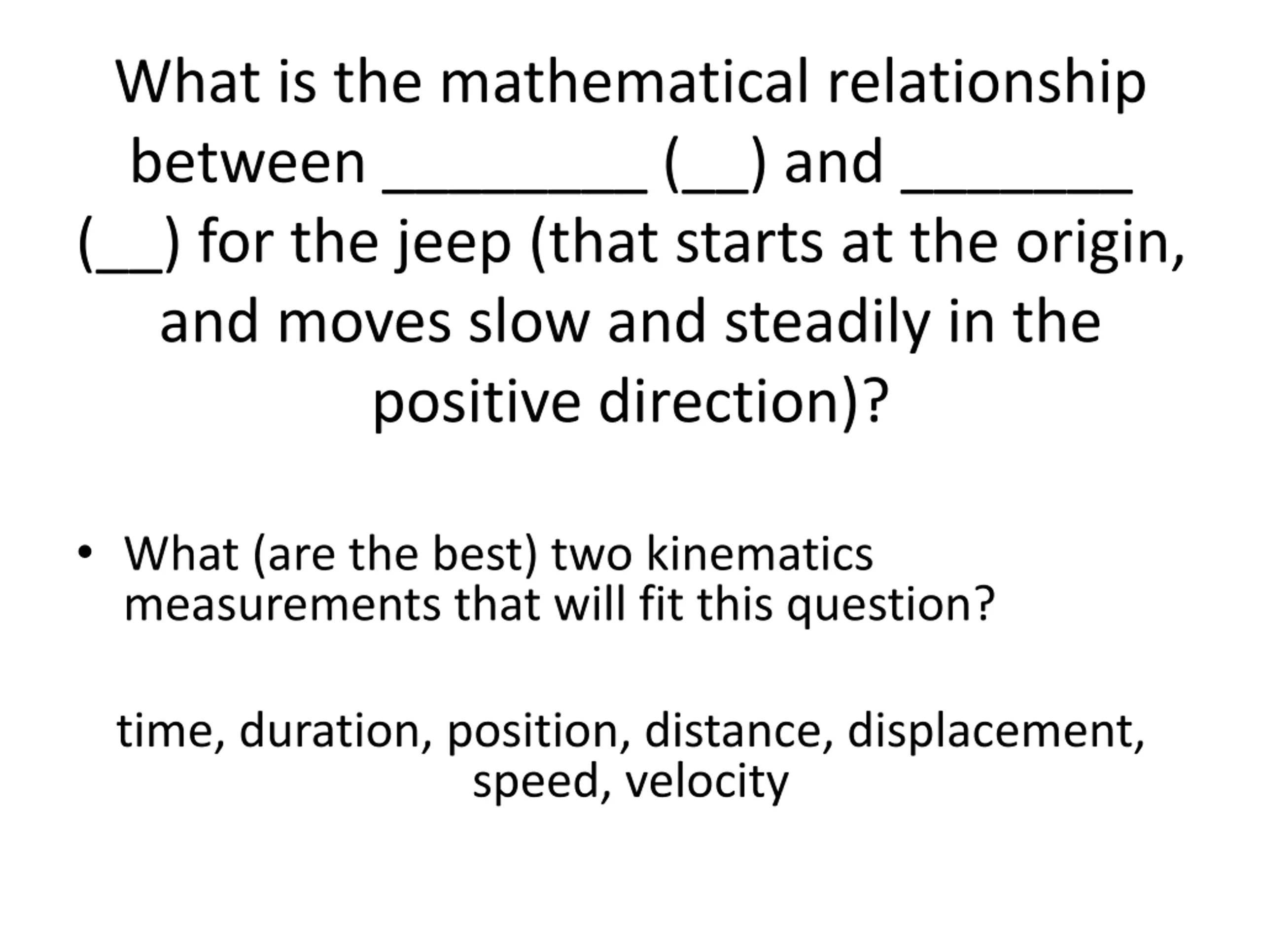What is the mathematical relationship between ________ (__) and _______ (__) for the jeep (that starts at the origin, and moves slow and steadily in the positive direction)? What (are the best) two kinematics measurements that will fit this question? time, duration, position, distance, displacement, speed, velocity