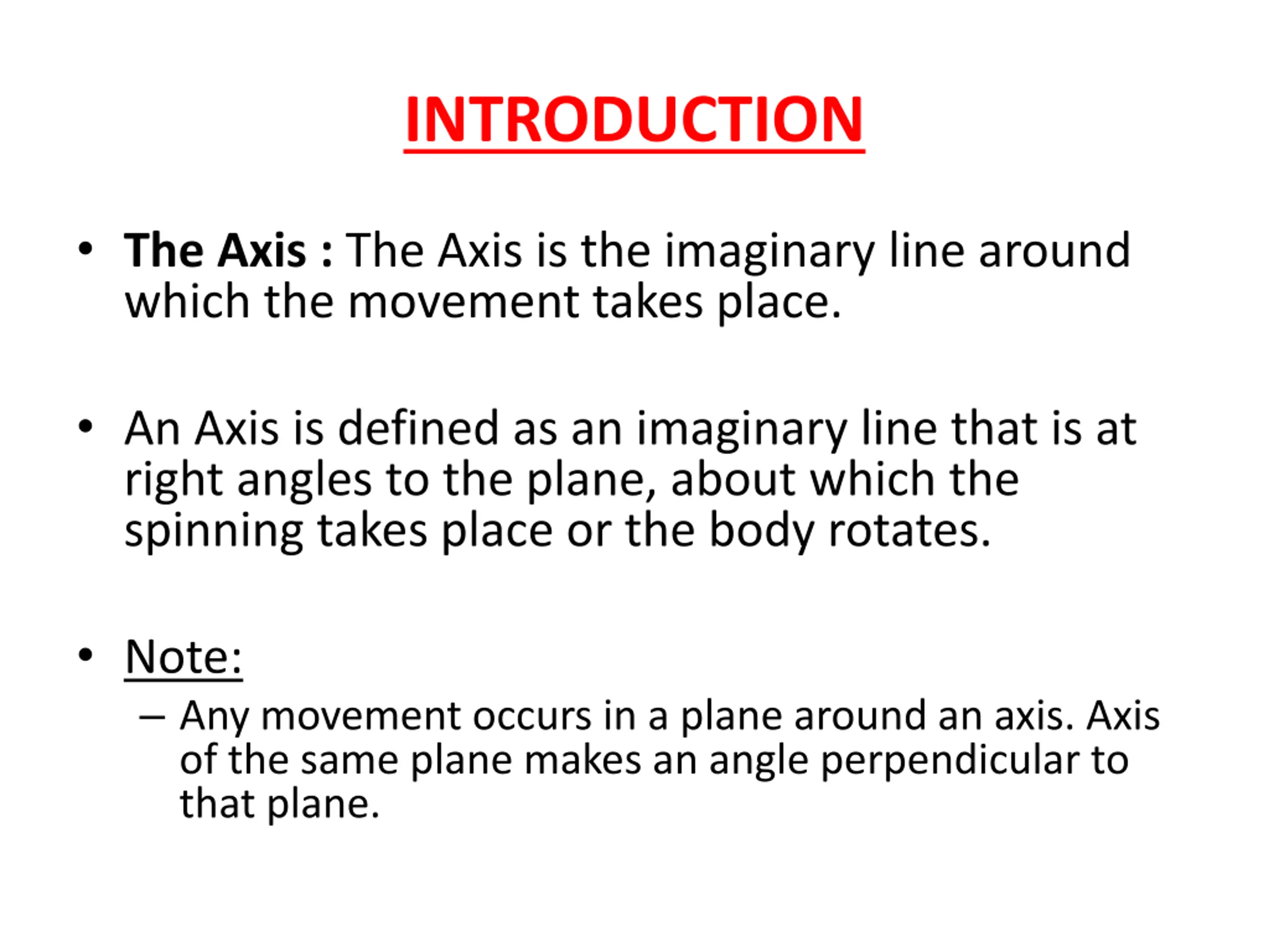 INTRODUCTION The Axis : The Axis is the imaginary line around which the movement takes place. An Axis is defined as an imaginary line that is at right angles to the plane, about which the spinning takes place or the body rotates. Note: Any movement occurs in a plane around an axis. Axis of the same plane makes an angle perpendicular to that plane.