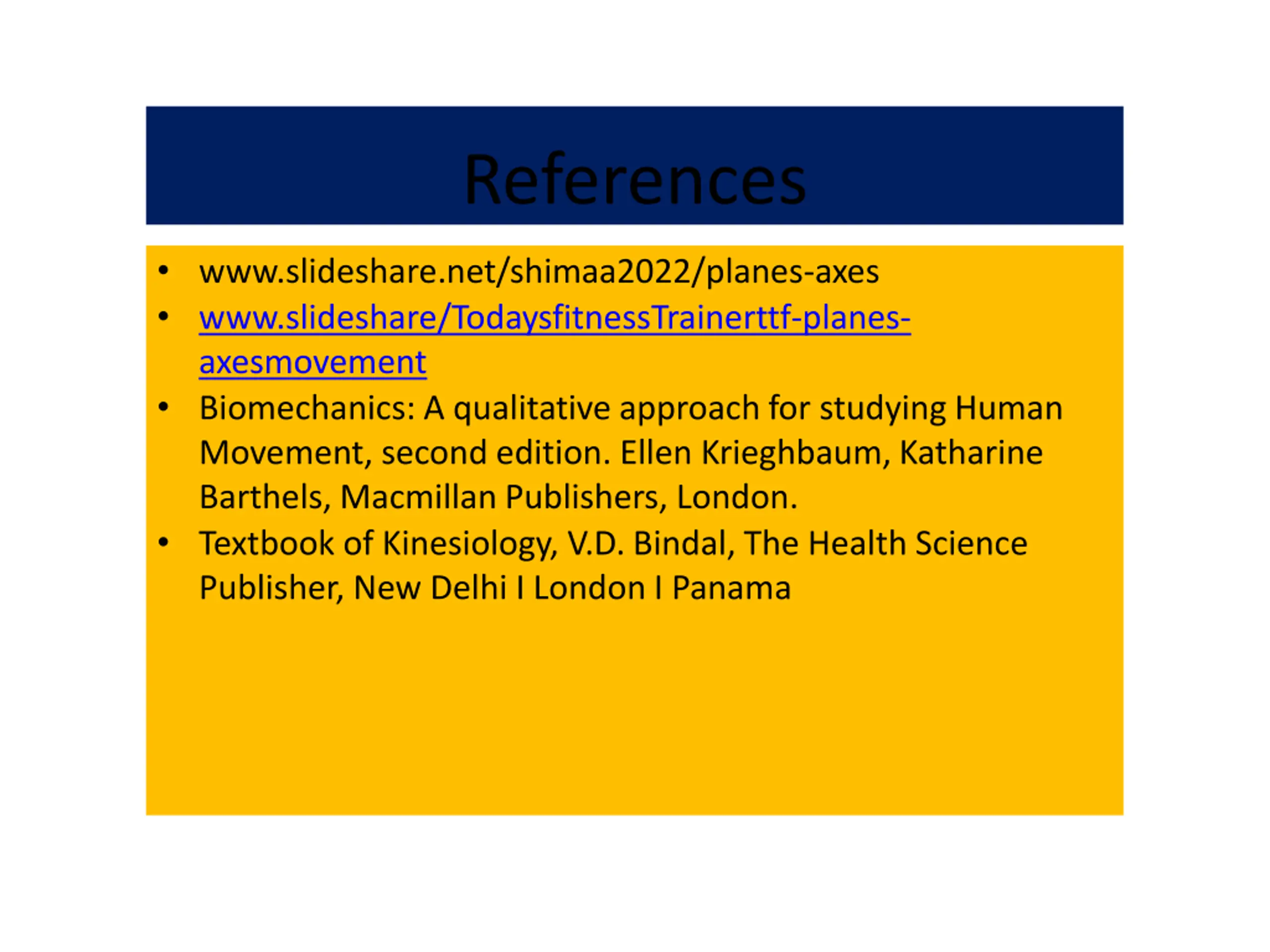 References www.slideshare.net/shimaa2022/planes-axes www.slideshare/TodaysfitnessTrainerttf-planes- axesmovement Biomechanics: A qualitative approach for studying Human Movement, second edition. Ellen Krieghbaum, Katharine Barthels, Macmillan Publishers, London. Textbook of Kinesiology, V.D. Bindal, The Health Science Publisher, New Delhi I London I Panama