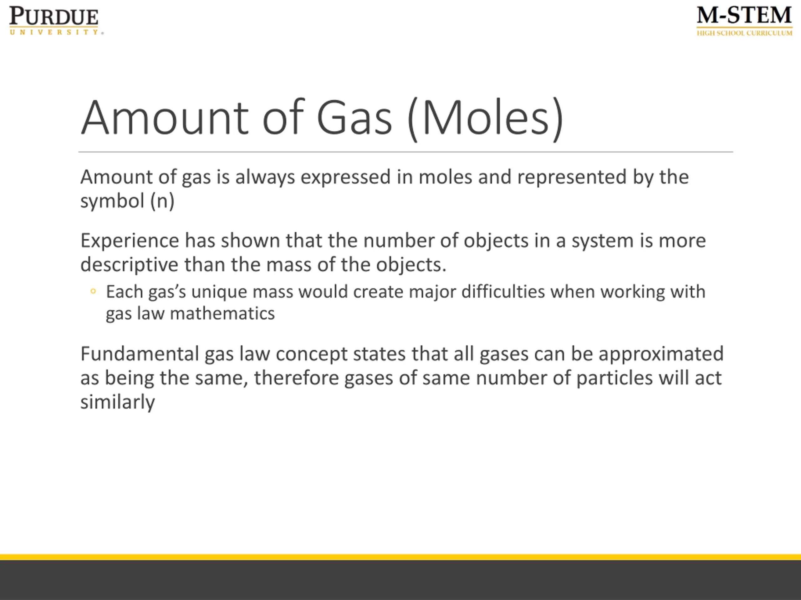 Amount of Gas (Moles) Amount of gas is always expressed in moles and represented by the symbol (n) Experience has shown that the number of objects in a system is more descriptive than the mass of the objects. Each gas s unique mass would create major difficulties when working with gas law mathematics Fundamental gas law concept states that all gases can be approximated as being the same, therefore gases of same number of particles will act similarly