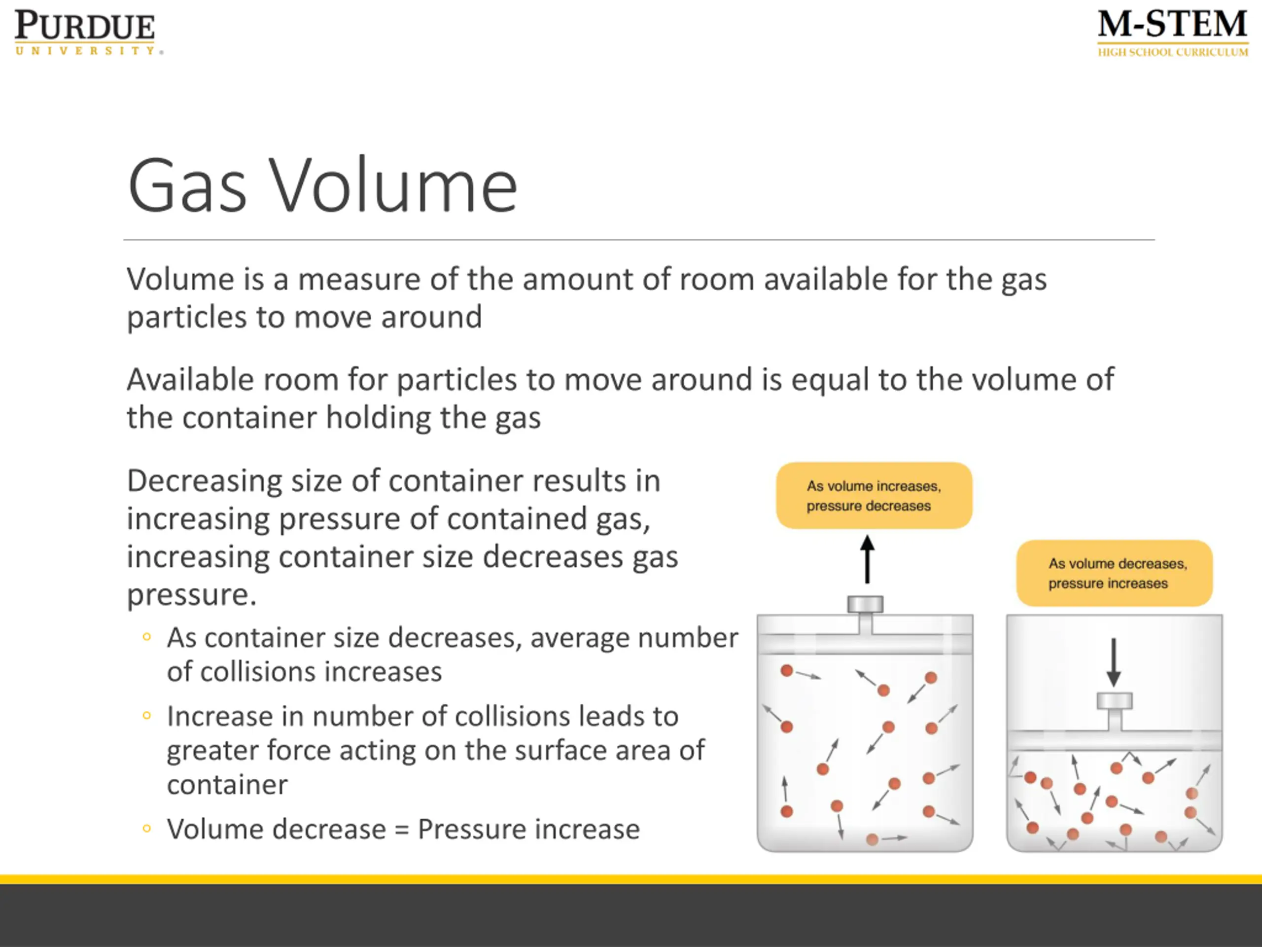 Gas Volume Volume is a measure of the amount of room available for the gas particles to move around Available room for particles to move around is equal to the volume of the container holding the gas Decreasing size of container results in increasing pressure of contained gas, increasing container size decreases gas pressure. As container size decreases, average number of collisions increases Increase in number of collisions leads to greater force acting on the surface area of container Volume decrease = Pressure increase