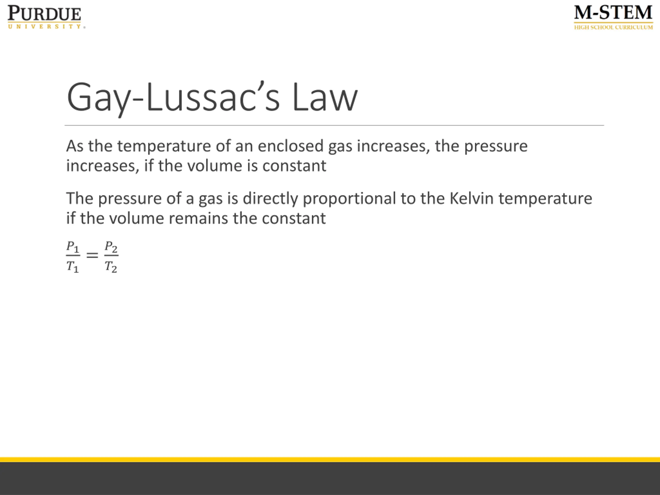 Gay-Lussacs Law As the temperature of an enclosed gas increases, the pressure increases, if the volume is constant The pressure of a gas is directly proportional to the Kelvin temperature if the volume remains the constant ?1 ?1=?2 ?2