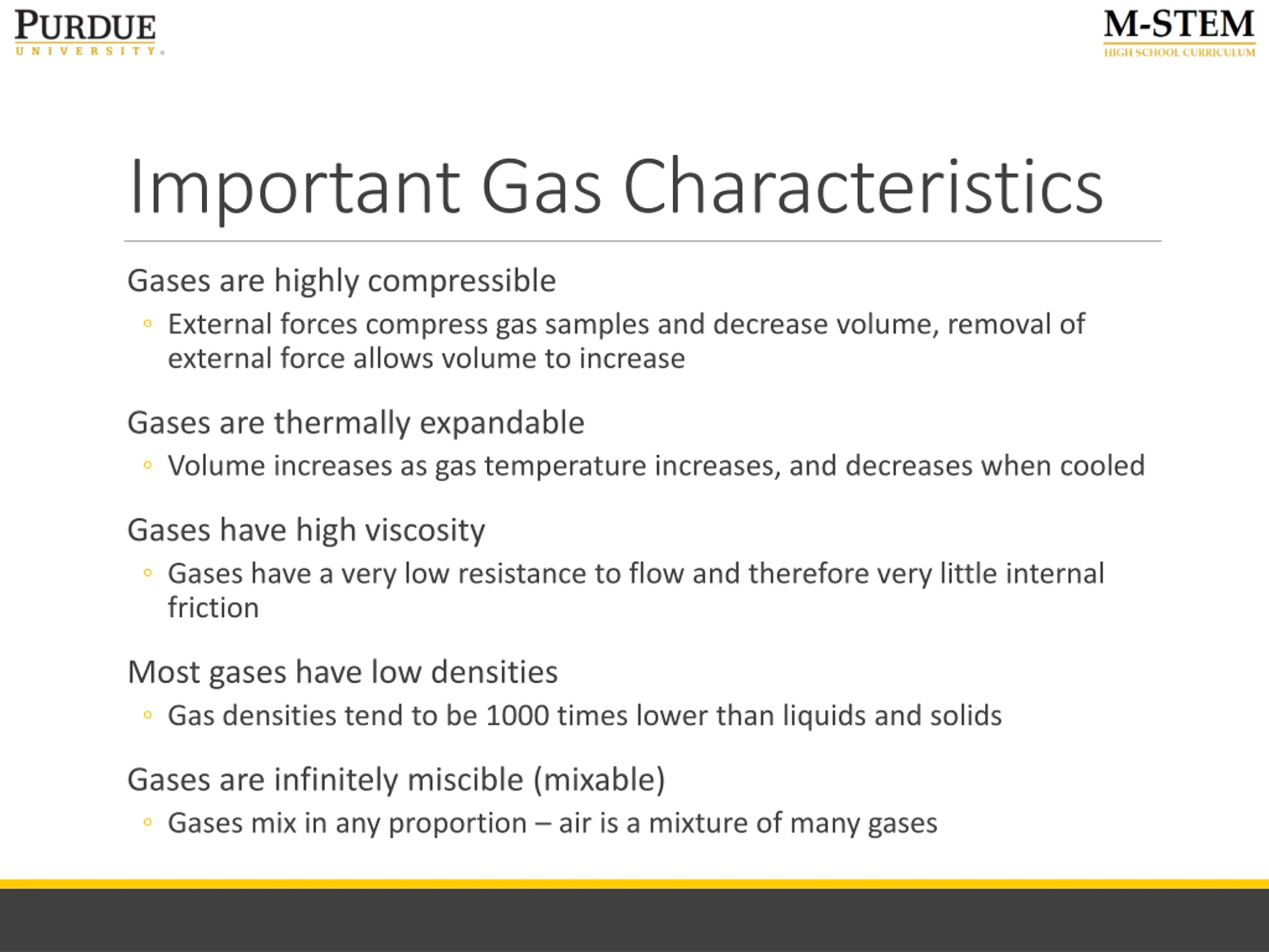 Important Gas Characteristics Gases are highly compressible External forces compress gas samples and decrease volume, removal of external force allows volume to increase Gases are thermally expandable Volume increases as gas temperature increases, and decreases when cooled Gases have high viscosity Gases have a very low resistance to flow and therefore very little internal friction Most gases have low densities Gas densities tend to be 1000 times lower than liquids and solids Gases are infinitely miscible (mixable) Gases mix in any proportion air is a mixture of many gases