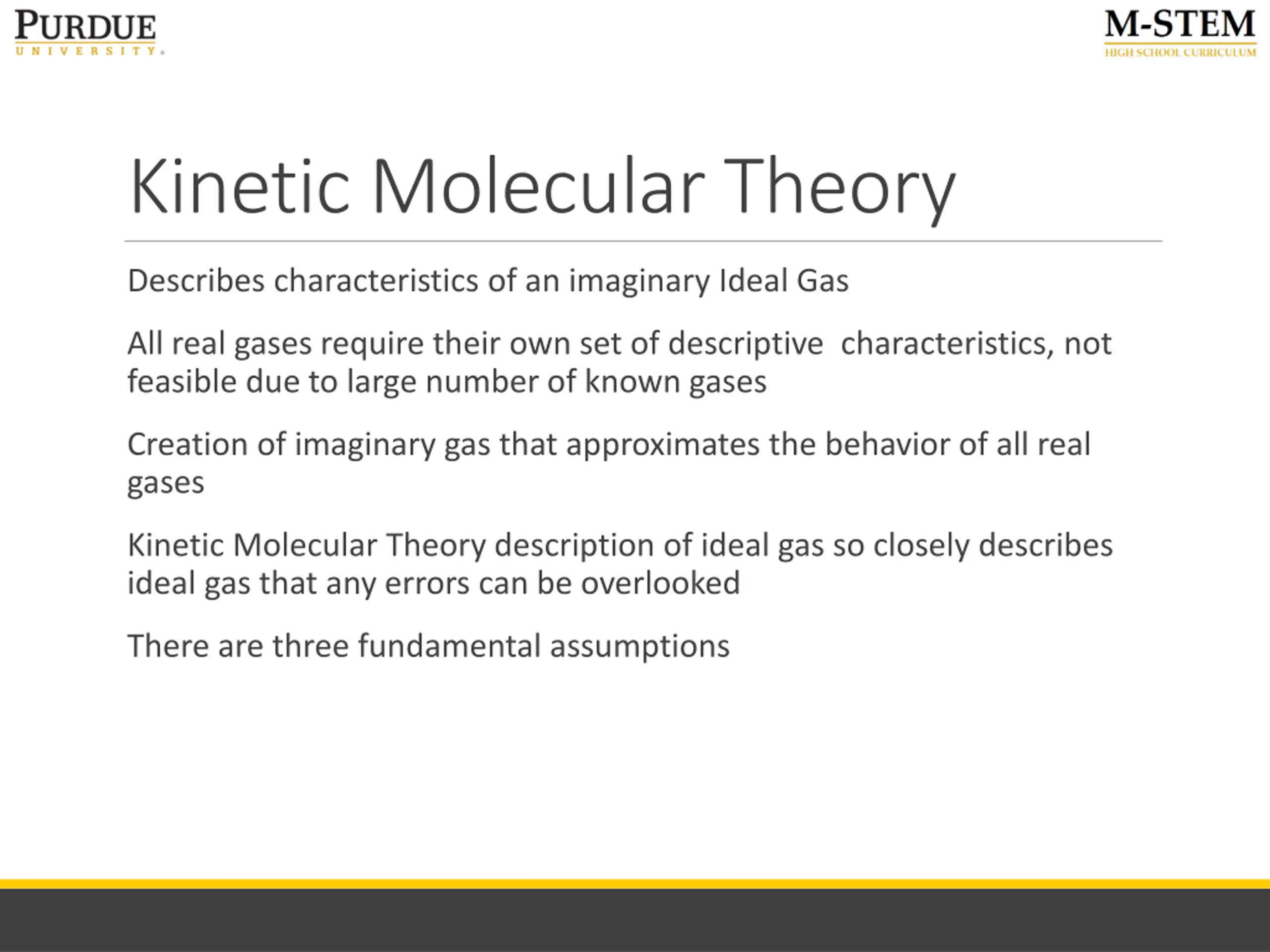 Kinetic Molecular Theory Describes characteristics of an imaginary Ideal Gas All real gases require their own set of descriptive characteristics, not feasible due to large number of known gases Creation of imaginary gas that approximates the behavior of all real gases Kinetic Molecular Theory description of ideal gas so closely describes ideal gas that any errors can be overlooked There are three fundamental assumptions
