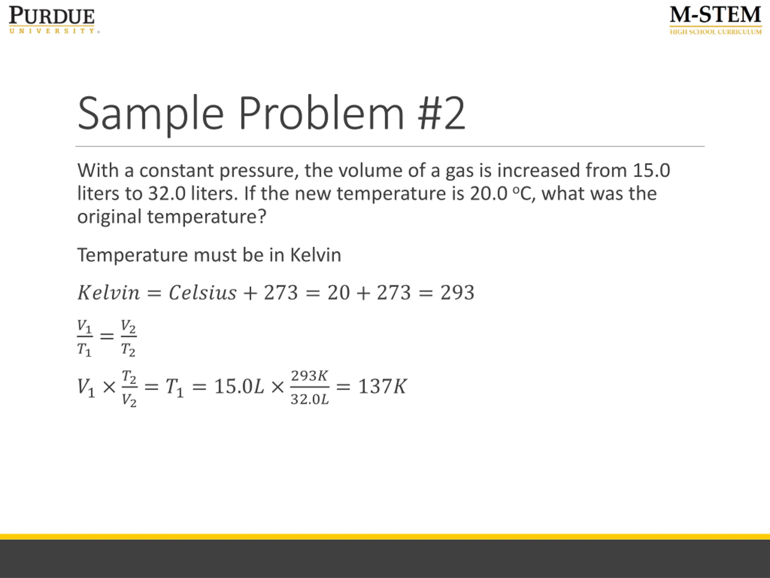 Sample Problem #2 With a constant pressure, the volume of a gas is increased from 15.0 liters to 32.0 liters. If the new temperature is 20.0 oC, what was the original temperature? Temperature must be in Kelvin ?????? = ??????? + 273 = 20 + 273 = 293 ?1 ?1=?2 ?1 ?2 ?2 ?2= ?1= 15.0? 293? 32.0?= 137?