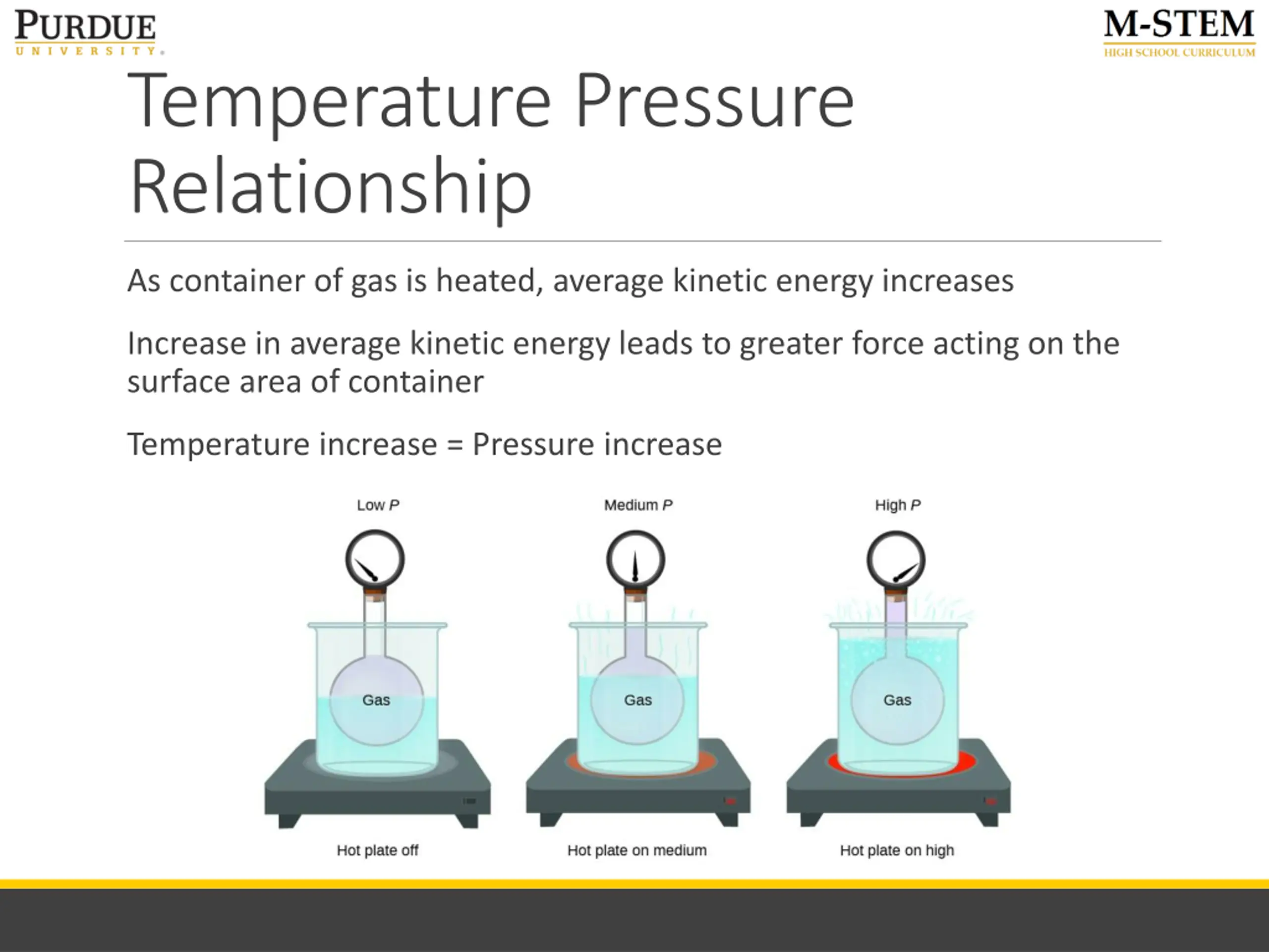 Temperature Pressure Relationship As container of gas is heated, average kinetic energy increases Increase in average kinetic energy leads to greater force acting on the surface area of container Temperature increase = Pressure increase
