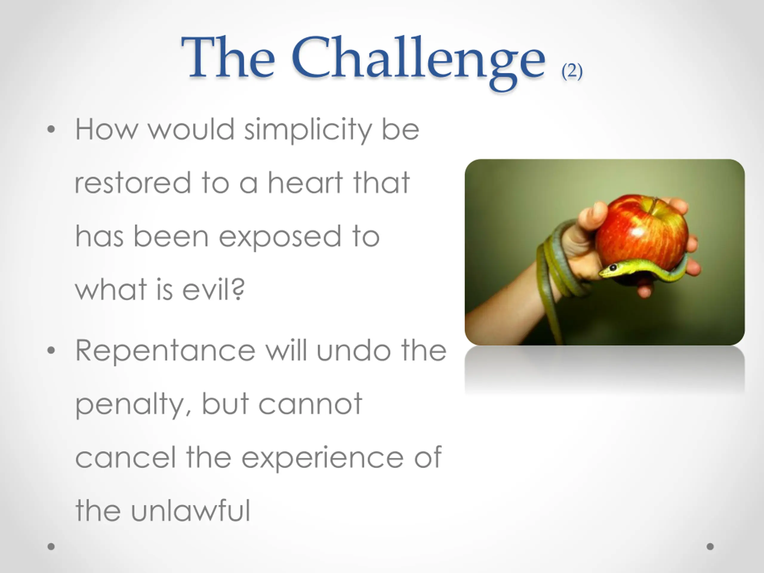 The Challenge (2) How would simplicity be https://primalmeded.files.wordpress.com/2011/05/apple_snake.jpg restored to a heart that has been exposed to what is evil? Repentance will undo the penalty, but cannot cancel the experience of the unlawful