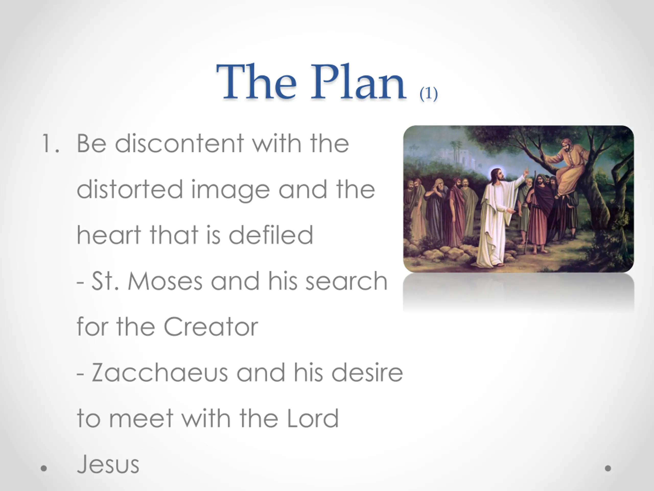 The Plan (1) https://gerardnadal.files.wordpress.com/2012/02/zacchaeus2.jpg 1. Be discontent with the distorted image and the heart that is defiled - St. Moses and his search for the Creator - Zacchaeus and his desire to meet with the Lord Jesus