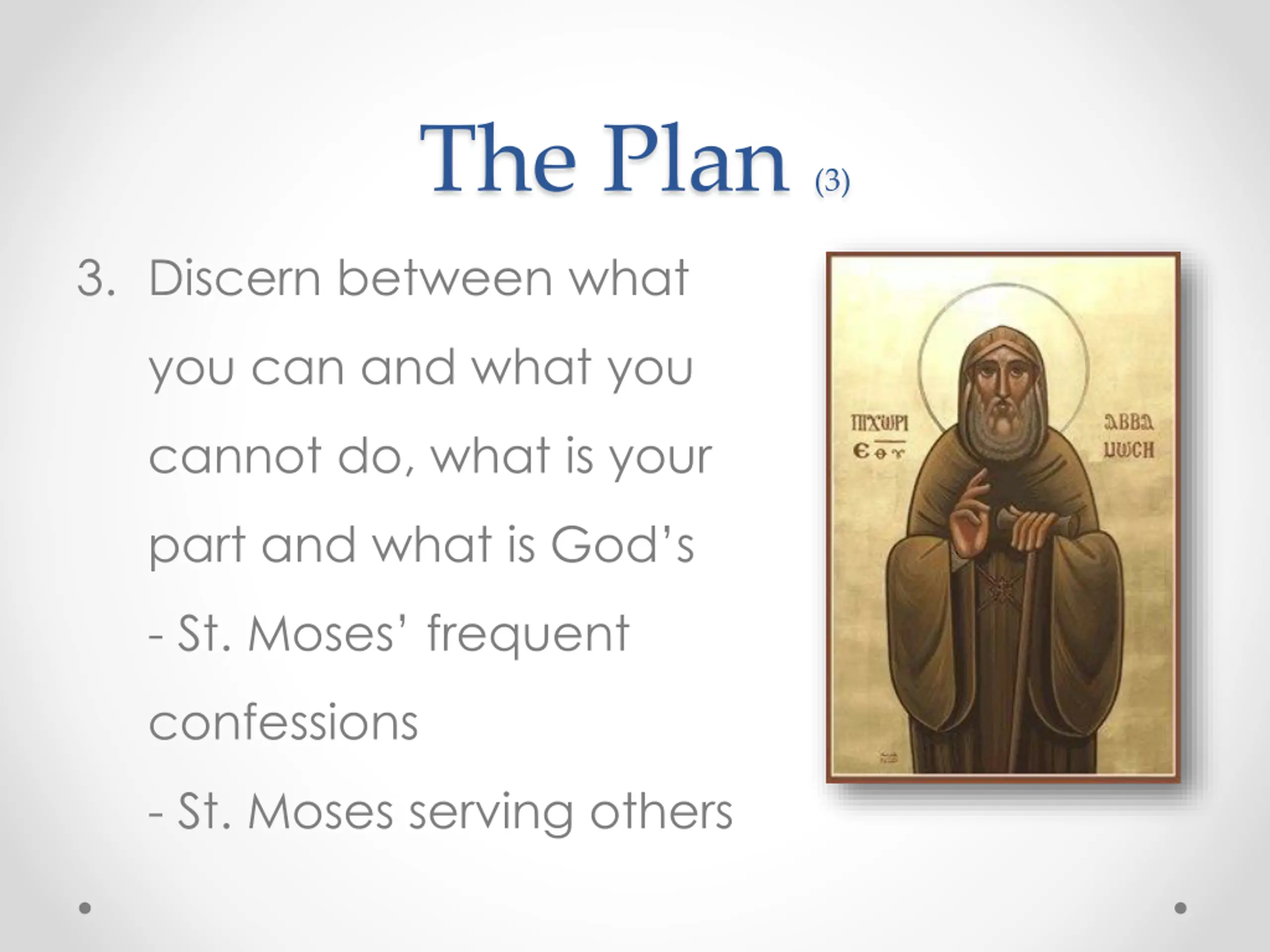 The Plan (3) http://1.bp.blogspot.com/-xD_TRSoPxrY/UdGWeaO17KI/AAAAAAAACKg/UIee8O0N2S8/s640/St.+Moses+the+black+.jpg 3. Discern between what you can and what you cannot do, what is your part and what is God s - St. Moses frequent confessions - St. Moses serving others