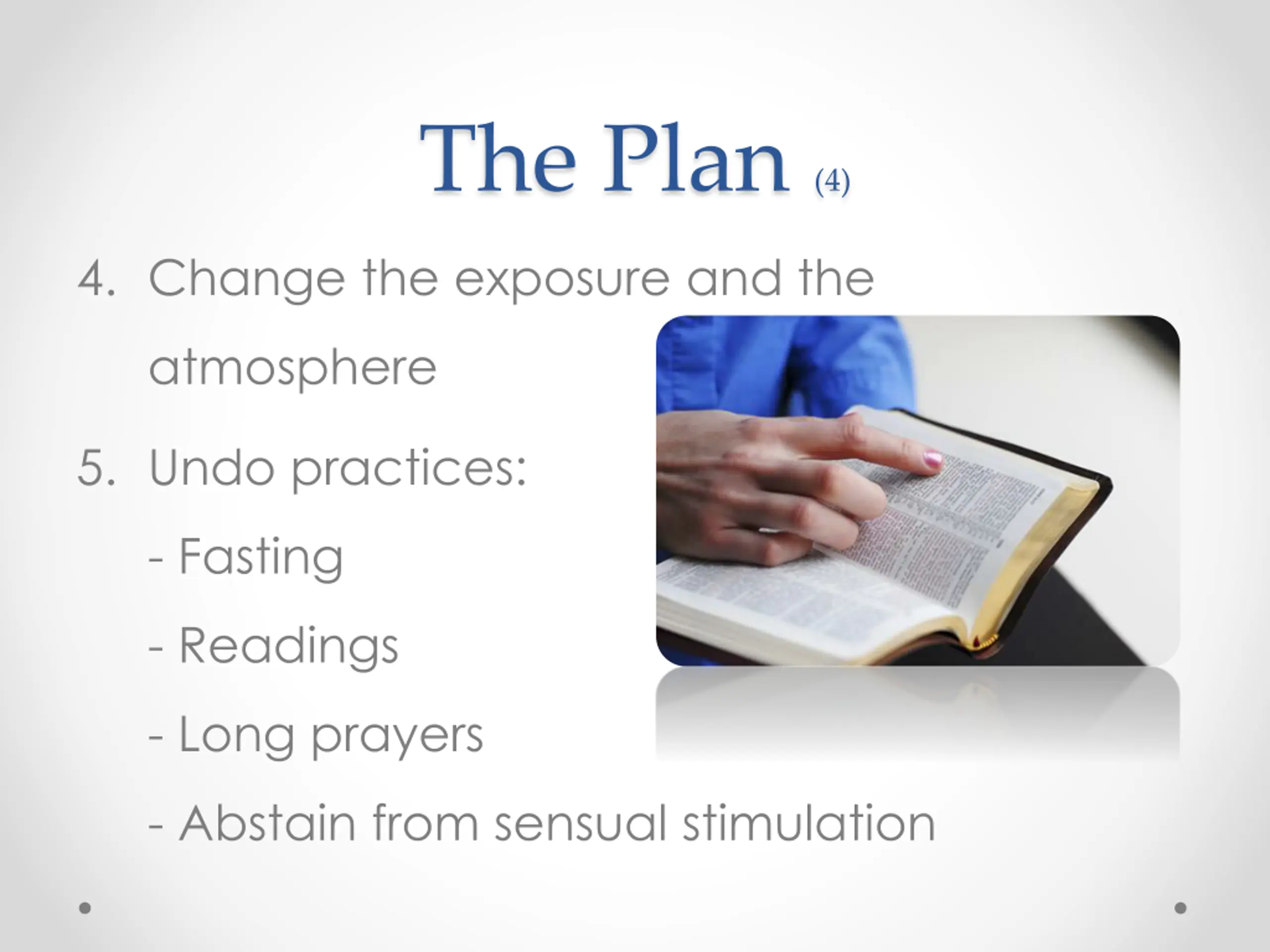 The Plan (4) 4. Change the exposure and the http://truediscipleship.com/wp-content/uploads/2015/11/Bible-reading.jpg atmosphere 5. Undo practices: - Fasting - Readings - Long prayers - Abstain from sensual stimulation