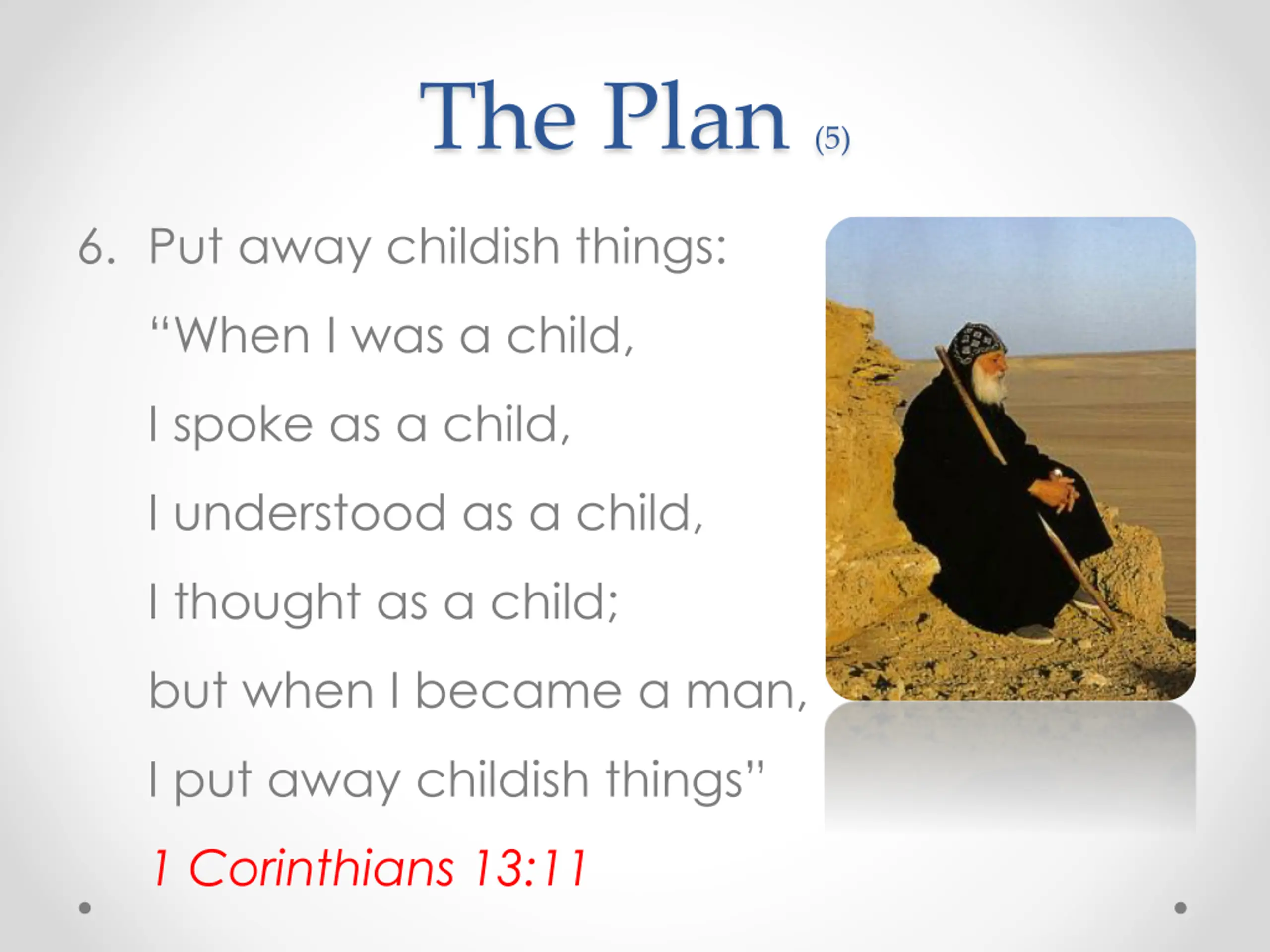 The Plan (5) 6. Put away childish things: http://www.kevinrdshepherd.info/images/monk_001sss.jpg When I was a child, I spoke as a child, I understood as a child, I thought as a child; but when I became a man, I put away childish things 1 Corinthians 13:11