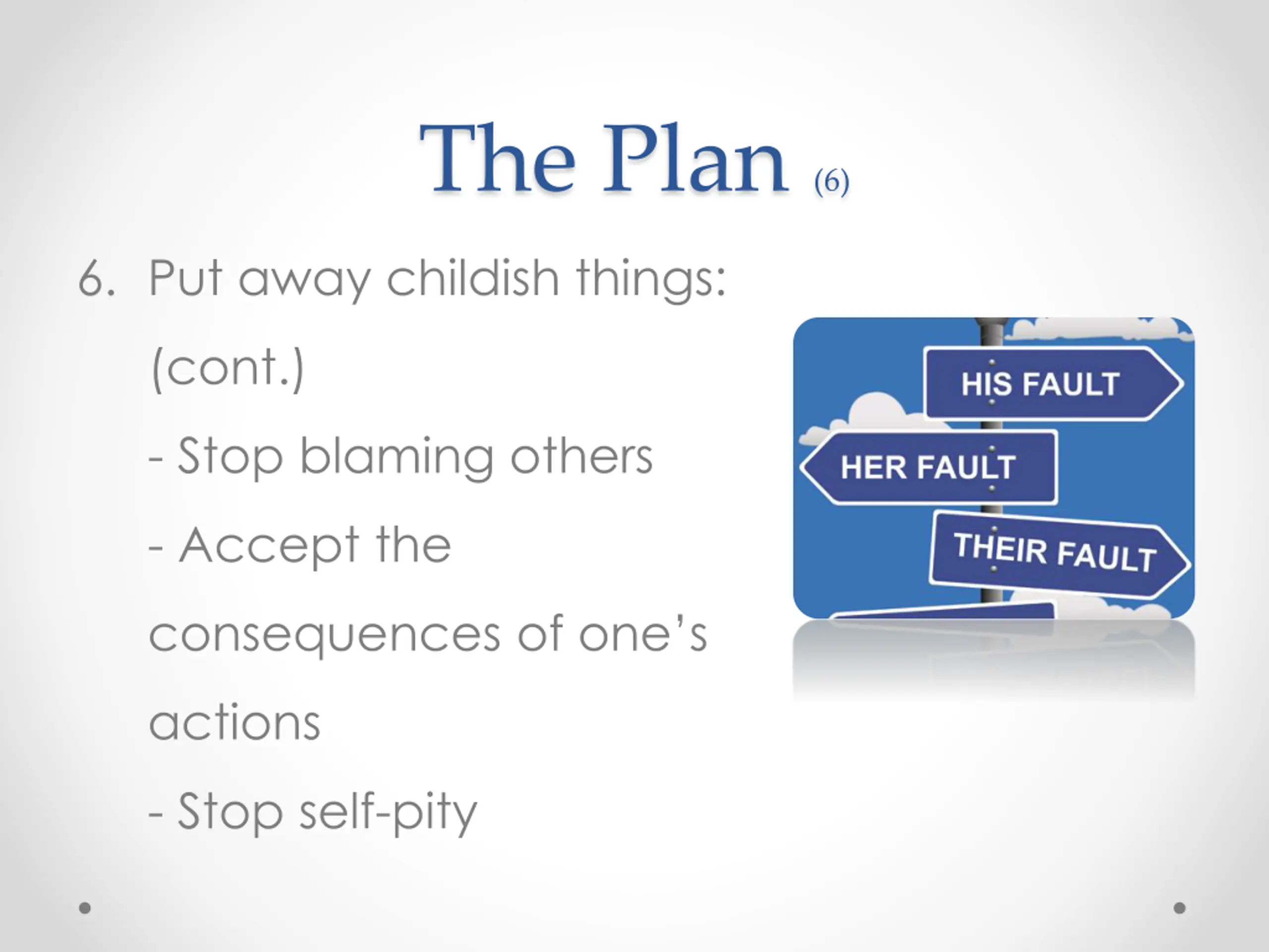 The Plan (6) 6. Put away childish things: http://www.nursetogether.com/sites/default/files/How-Nurses-Can-Stop-Blaming-Others-and-Change-Their-Life-Today.jpg (cont.) - Stop blaming others - Accept the consequences of one s actions - Stop self-pity