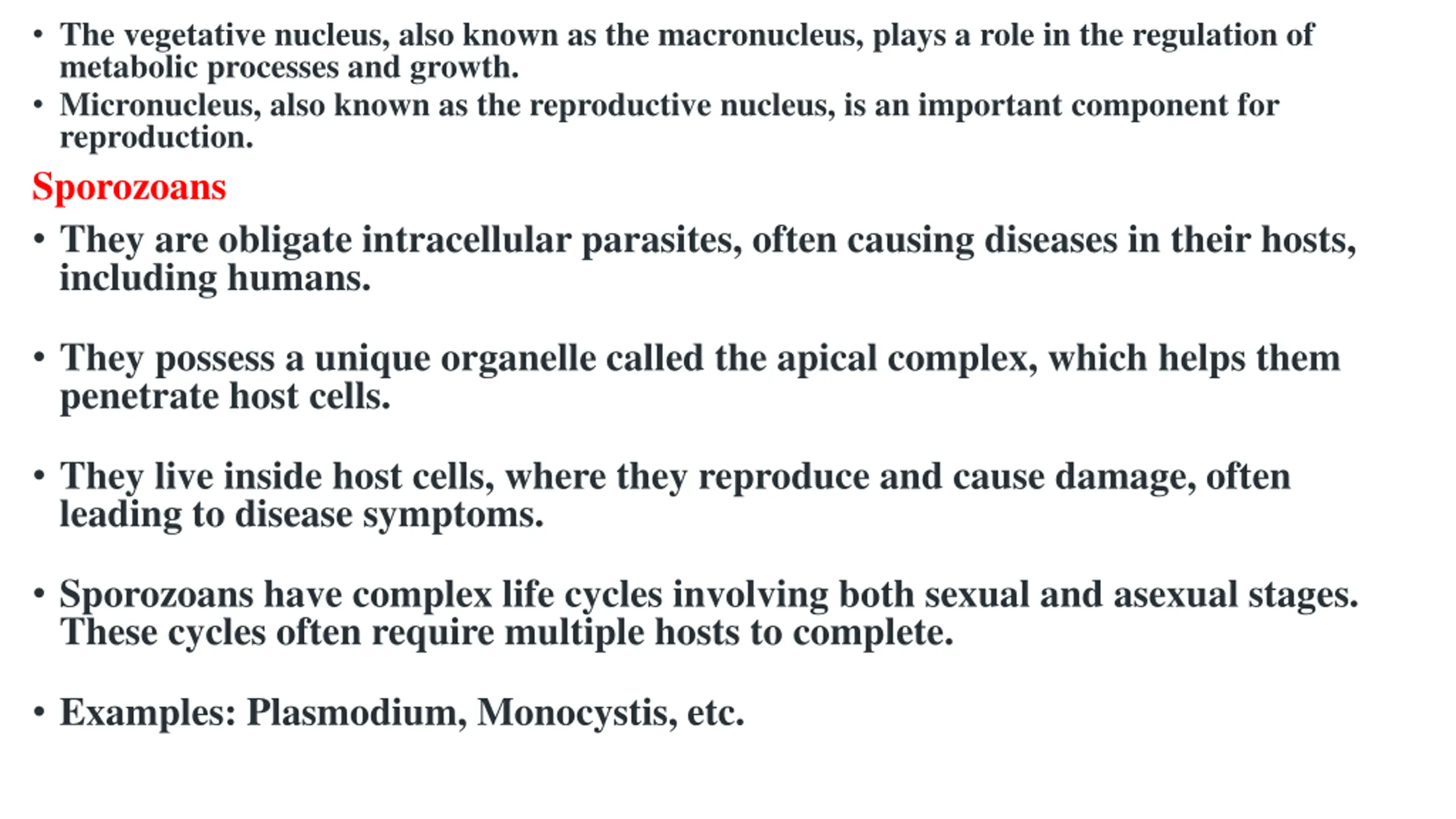 The vegetative nucleus, also known as the macronucleus, plays a role in the regulation of metabolic processes and growth. Micronucleus, also known as the reproductive nucleus, is an important component for reproduction. Sporozoans They are obligate intracellular parasites, often causing diseases in their hosts, including humans. They possess a unique organelle called the apical complex, which helps them penetrate host cells. They live inside host cells, where they reproduce and cause damage, often leading to disease symptoms. Sporozoans have complex life cycles involving both sexual and asexual stages. These cycles often require multiple hosts to complete. Examples: Plasmodium, Monocystis, etc.