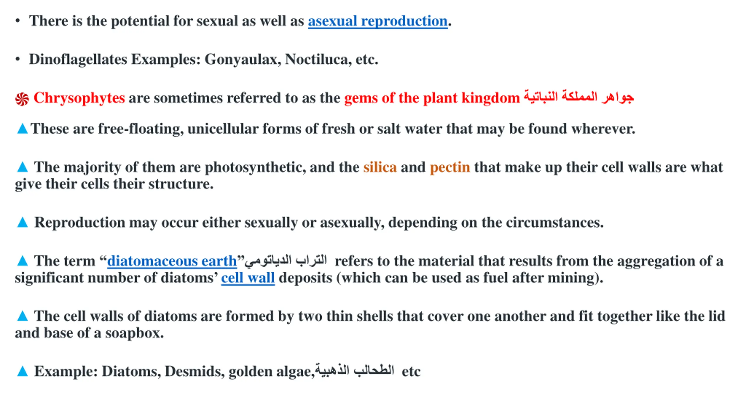 There is the potential for sexual as well as asexual reproduction. Dinoflagellates Examples: Gonyaulax, Noctiluca, etc. Chrysophytes are sometimes referred to as the gems of the plant kingdom These are free-floating, unicellular forms of fresh or salt water that may be found wherever. The majority of them are photosynthetic, and the silica and pectin that make up their cell walls are what give their cells their structure. Reproduction may occur either sexually or asexually, depending on the circumstances. The term diatomaceous earth refers to the material that results from the aggregation of a significant number of diatoms cell wall deposits (which can be used as fuel after mining). The cell walls of diatoms are formed by two thin shells that cover one another and fit together like the lid and base of a soapbox. Example: Diatoms, Desmids, golden algae, etc
