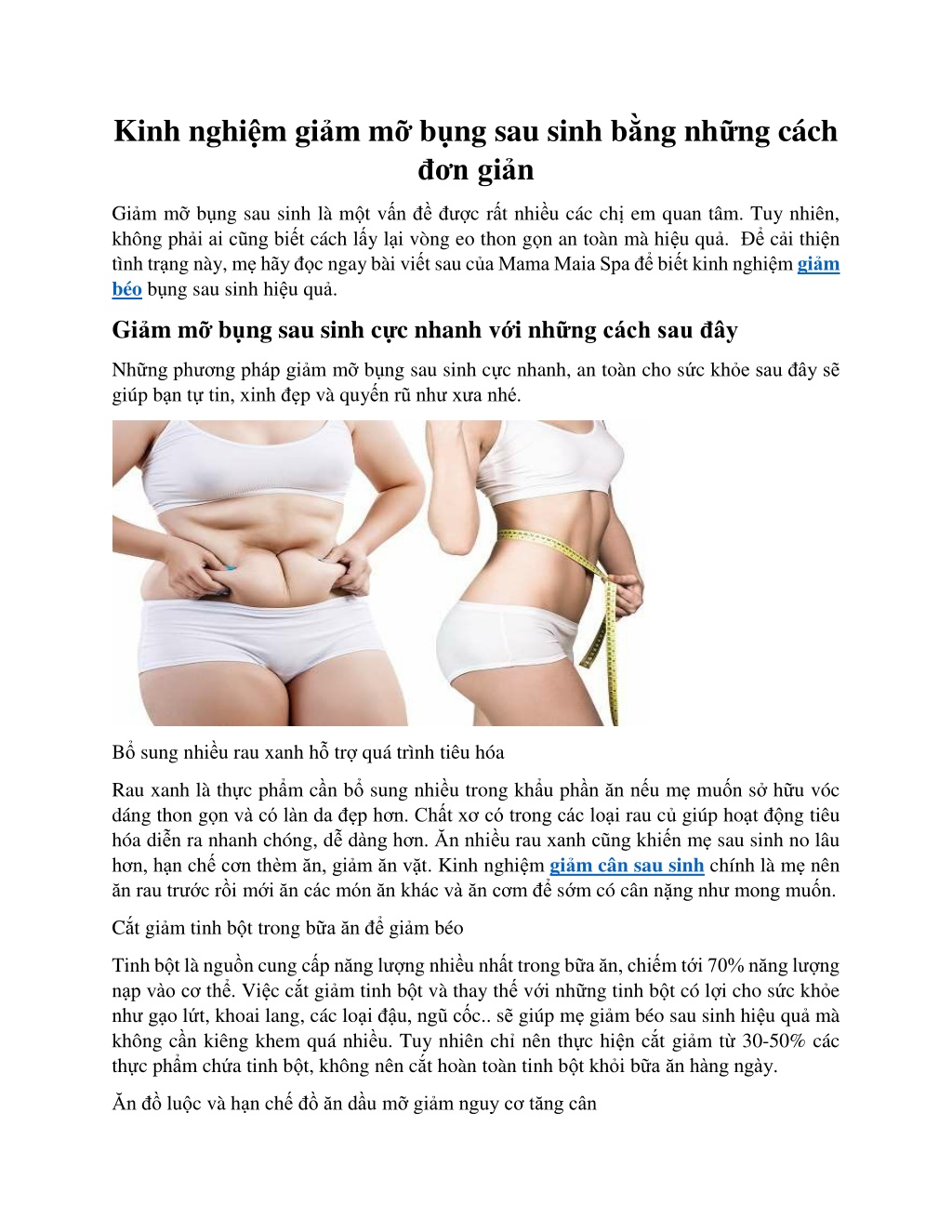 Kinh nghim gim m bng sau sinh bng nhng cch n gi n Gi m m b ng sau sinh l m t v n c r t nhi u c c ch em quan t m. Tuy nhi n, kh ng ph i ai c ng bi t c ch l y l i v ng eo thon g n an to n m hi u qu . c i thi n t nh tr ng n y, m h y c ngay b i vi t sau c a Mama Maia Spa bi t kinh nghi m gi m b o b ng sau sinh hi u qu . Gi m m b ng sau sinh c c nhanh v i nh ng c ch sau y Nh ng ph ng ph p gi m m b ng sau sinh c c nhanh, an to n cho s c kh e sau y s gi p b n t tin, xinh p v quy n r nh x a nh . B sung nhi u rau xanh h tr qu tr nh ti u h a Rau xanh l th c ph m c n b sung nhi u trong kh u ph n n n u m mu n s h u v c d ng thon g n v c l n da p h n. Ch t x c trong c c lo i rau c gi p ho t ng ti u h a di n ra nhanh ch ng, d d ng h n. n nhi u rau xanh c ng khi n m sau sinh no l u h n, h n ch c n th m n, gi m n v t. Kinh nghi m gi m c n sau sinh ch nh l m n n n rau tr c r i m i n c c m n n kh c v n c m s m c c n n ng nh mong mu n. C t gi m tinh b t trong b a n gi m b o Tinh b t l ngu n cung c p n ng l ng nhi u nh t trong b a n, chi m t i 70% n ng l ng n p v o c th . Vi c c t gi m tinh b t v thay th v i nh ng tinh b t c l i cho s c kh e nh g o l t, khoai lang, c c lo i u, ng c c.. s gi p m gi m b o sau sinh hi u qu m kh ng c n ki ng khem qu nhi u. Tuy nhi n ch n n th c hi n c t gi m t 30-50% c c th c ph m ch a tinh b t, kh ng n n c t ho n to n tinh b t kh i b a n h ng ng y. n lu c v h n ch n d u m gi m nguy c t ng c n