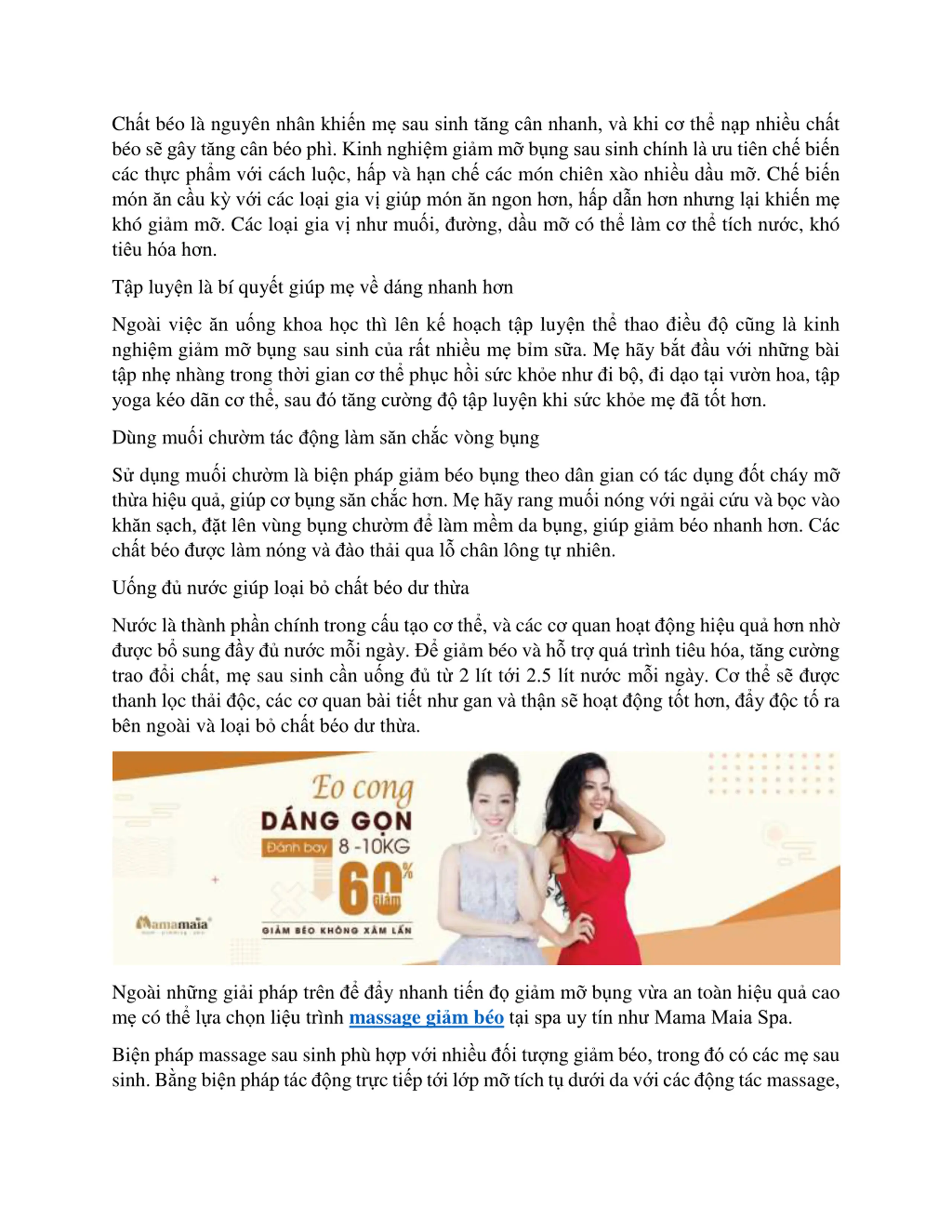 Cht bo l nguyn nhn khin msau sinh tng cn nhanh, v khi c th np nhiu cht b o s g y t ng c n b o ph . Kinh nghi m gi m m b ng sau sinh ch nh l u ti n ch bi n c c th c ph m v i c ch lu c, h p v h n ch c c m n chi n x o nhi u d u m . Ch bi n m n n c u k v i c c lo i gia v gi p m n n ngon h n, h p d n h n nh ng l i khi n m kh gi m m . C c lo i gia v nh mu i, ng, d u m c th l m c th t ch n c, kh ti u h a h n. T p luy n l b quy t gi p m v d ng nhanh h n Ngo i vi c n u ng khoa h c th l n k ho ch t p luy n th thao i u c ng l kinh nghi m gi m m b ng sau sinh c a r t nhi u m b m s a. M h y b t u v i nh ng b i t p nh nh ng trong th i gian c th ph c h i s c kh e nh i b , i d o t i v n hoa, t p yoga k o d n c th , sau t ng c ng t p luy n khi s c kh e m t t h n. D ng mu i ch m t c ng l m s n ch c v ng b ng S d ng mu i ch m l bi n ph p gi m b o b ng theo d n gian c t c d ng t ch y m th a hi u qu , gi p c b ng s n ch c h n. M h y rang mu i n ng v i ng i c u v b c v o kh n s ch, t l n v ng b ng ch m l m m m da b ng, gi p gi m b o nhanh h n. C c ch t b o c l m n ng v o th i qua l ch n l ng t nhi n. U ng n c gi p lo i b ch t b o d th a N c l th nh ph n ch nh trong c u t o c th , v c c c quan ho t ng hi u qu h n nh c b sung y n c m i ng y. gi m b o v h tr qu tr nh ti u h a, t ng c ng trao i ch t, m sau sinh c n u ng t 2 l t t i 2.5 l t n c m i ng y. C th s c thanh l c th i c, c c c quan b i ti t nh gan v th n s ho t ng t t h n, y c t ra b n ngo i v lo i b ch t b o d th a. Ngo i nh ng gi i ph p tr n y nhanh ti n gi m m b ng v a an to n hi u qu cao m c th l a ch n li u tr nh massage gi m b o t i spa uy t n nh Mama Maia Spa. Bi n ph p massage sau sinh ph h p v i nhi u i t ng gi m b o, trong c c c m sau sinh. B ng bi n ph p t c ng tr c ti p t i l p m t ch t d i da v i c c ng t c massage,