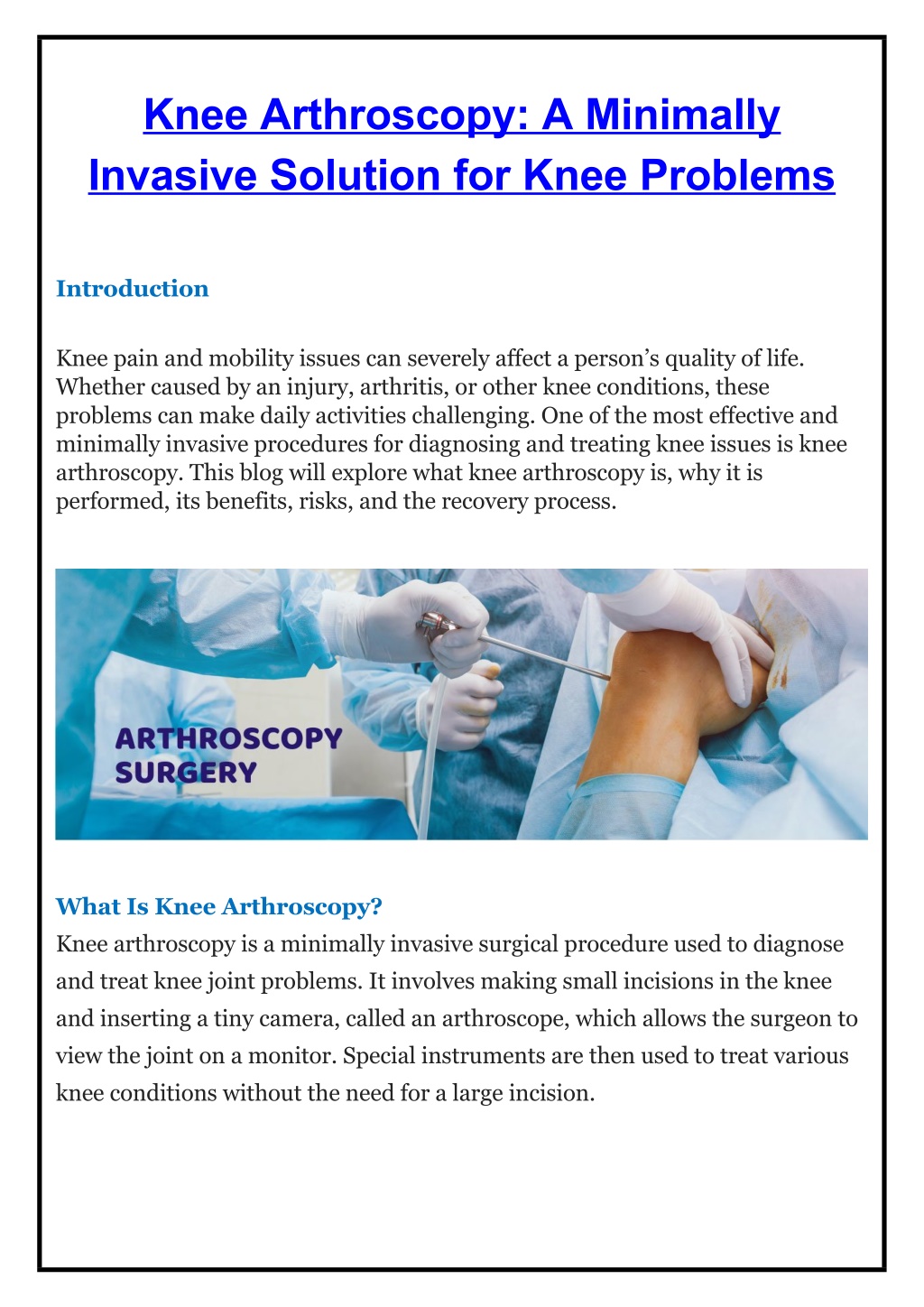 Knee Arthroscopy: A Minimally Invasive Solution for Knee Problems Introduction Knee pain and mobility issues can severely affect a person s quality of life. Whether caused by an injury, arthritis, or other knee conditions, these problems can make daily activities challenging. One of the most effective and minimally invasive procedures for diagnosing and treating knee issues is knee arthroscopy. This blog will explore what knee arthroscopy is, why it is performed, its benefits, risks, and the recovery process. What Is Knee Arthroscopy? Knee arthroscopy is a minimally invasive surgical procedure used to diagnose and treat knee joint problems. It involves making small incisions in the knee and inserting a tiny camera, called an arthroscope, which allows the surgeon to view the joint on a monitor. Special instruments are then used to treat various knee conditions without the need for a large incision.