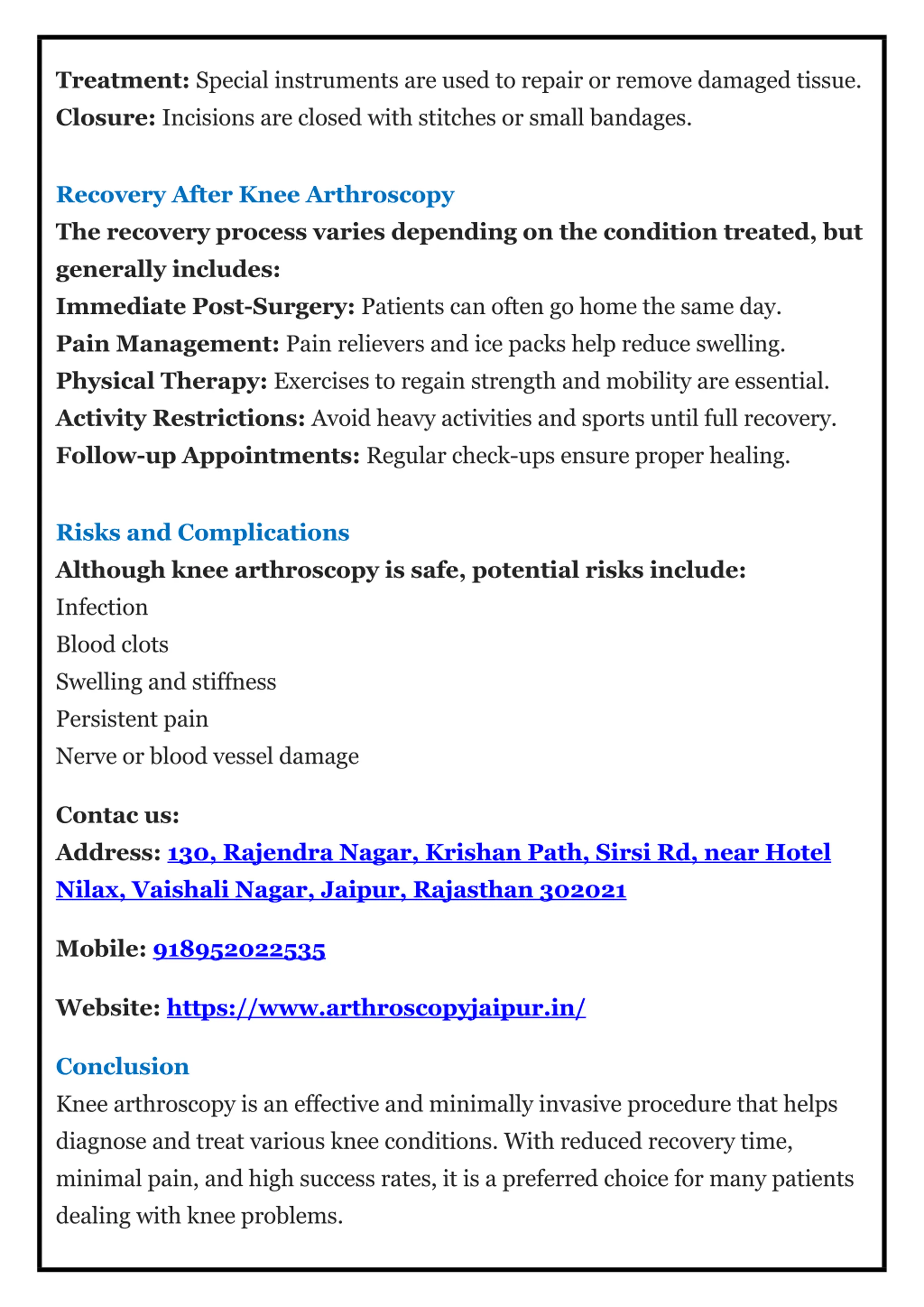 Treatment: Special instruments are used to repair or remove damaged tissue. Closure: Incisions are closed with stitches or small bandages. Recovery After Knee Arthroscopy The recovery process varies depending on the condition treated, but generally includes: Immediate Post-Surgery: Patients can often go home the same day. Pain Management: Pain relievers and ice packs help reduce swelling. Physical Therapy: Exercises to regain strength and mobility are essential. Activity Restrictions: Avoid heavy activities and sports until full recovery. Follow-up Appointments: Regular check-ups ensure proper healing. Risks and Complications Although knee arthroscopy is safe, potential risks include: Infection Blood clots Swelling and stiffness Persistent pain Nerve or blood vessel damage Contac us: Address: 130, Rajendra Nagar, Krishan Path, Sirsi Rd, near Hotel Nilax, Vaishali Nagar, Jaipur, Rajasthan 302021 Mobile: 918952022535 Website: https://www.arthroscopyjaipur.in/ Conclusion Knee arthroscopy is an effective and minimally invasive procedure that helps diagnose and treat various knee conditions. With reduced recovery time, minimal pain, and high success rates, it is a preferred choice for many patients dealing with knee problems.