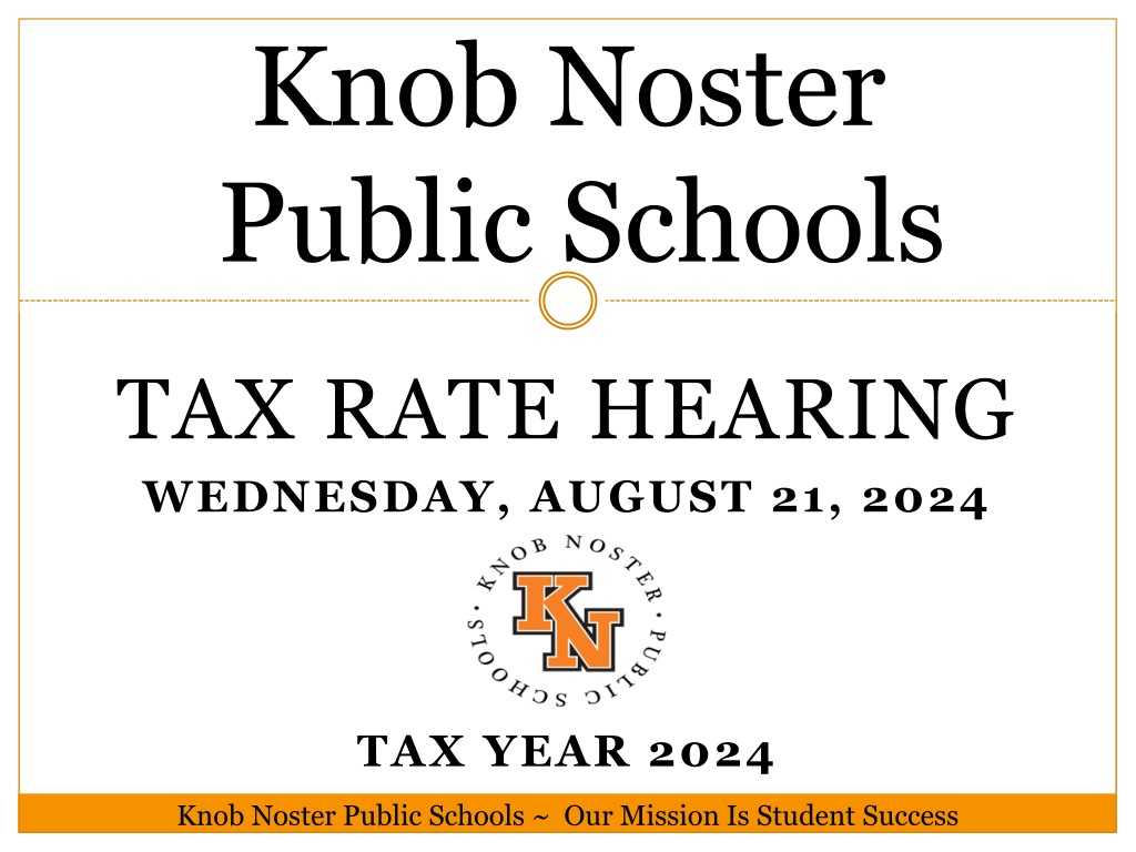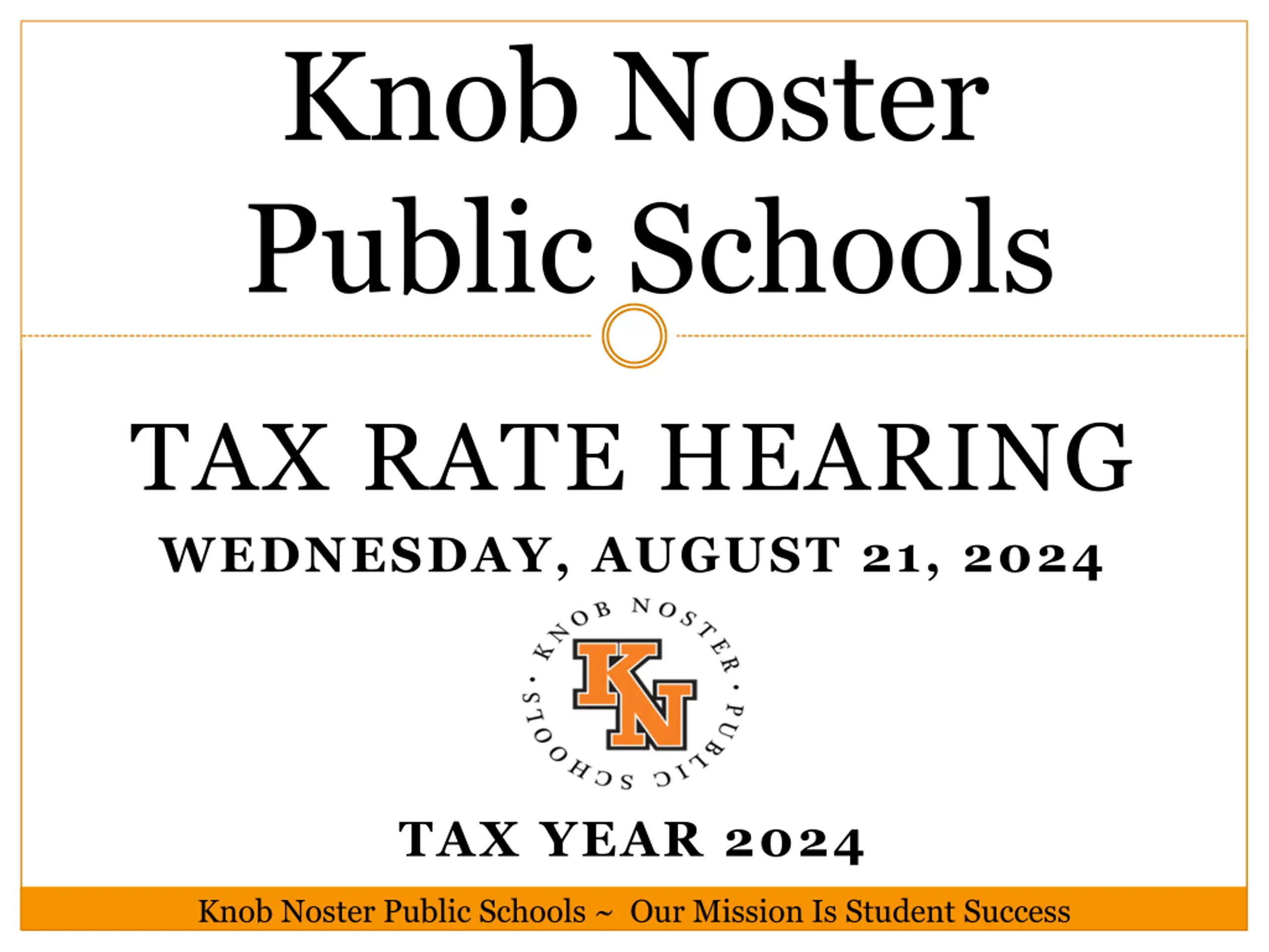 Knob Noster Public Schools TAX RATE HEARING WEDNESDAY, AUGUST 21, 2024 TAX YEAR 2024 Knob Noster Public Schools ~ Our Mission Is Student Success