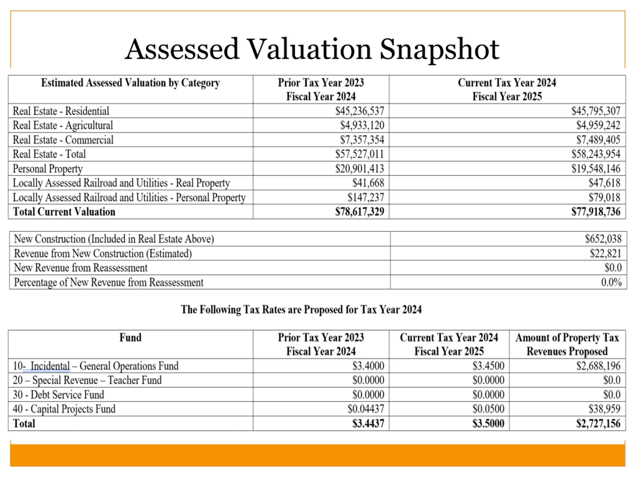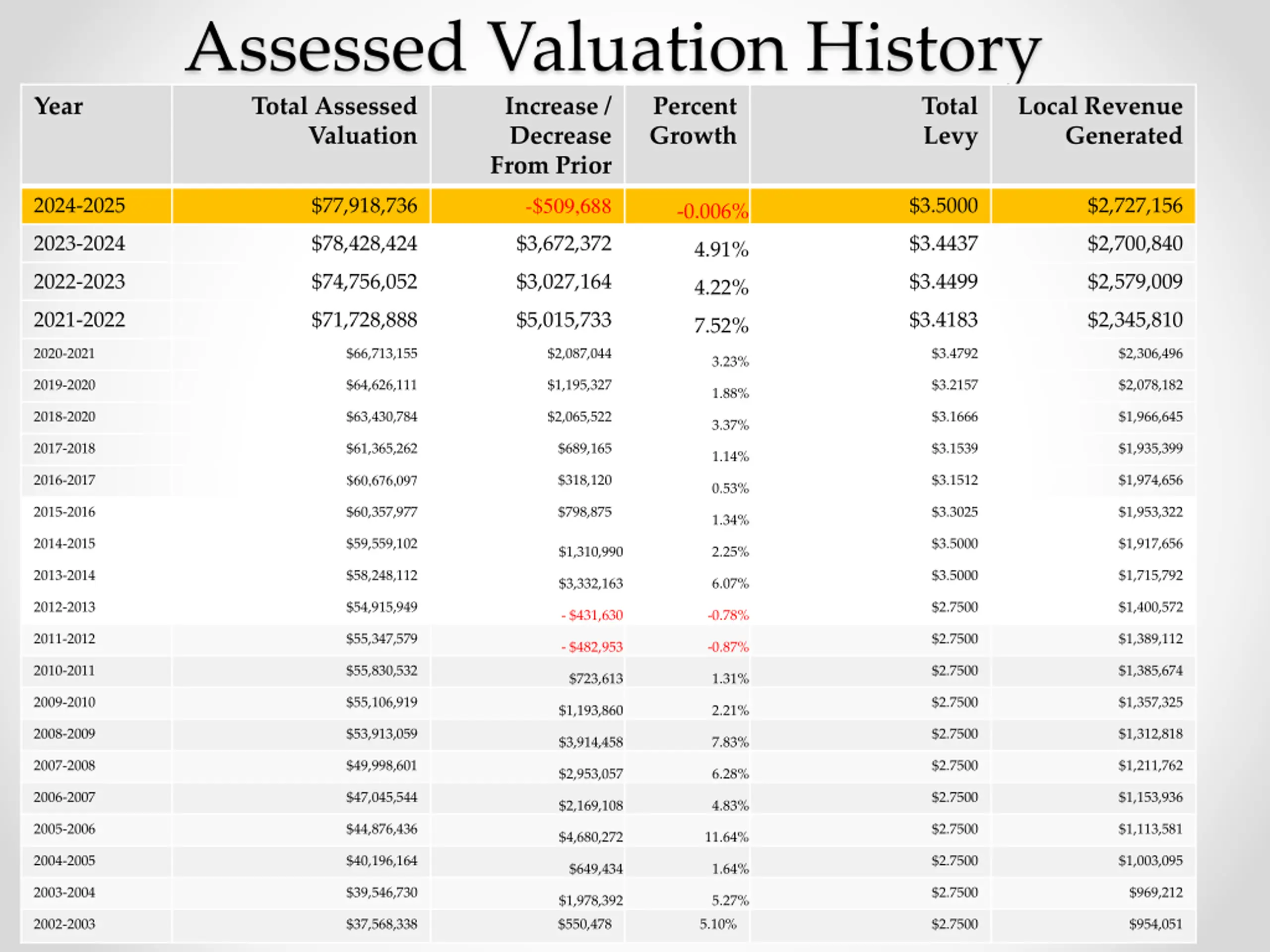 Assessed Valuation History Total Assessed Valuation Decrease From Prior Year Increase / Percent Growth Total Levy Local Revenue Generated -$509,688 2024-2025 $77,918,736 $3.5000 $2,727,156 -0.006% 2023-2024 $78,428,424 $3,672,372 $3.4437 $2,700,840 4.91% 2022-2023 $74,756,052 $3,027,164 $3.4499 $2,579,009 4.22% 2021-2022 $71,728,888 $5,015,733 $3.4183 $2,345,810 7.52% 2020-2021 $66,713,155 $2,087,044 $3.4792 $2,306,496 3.23% 2019-2020 $64,626,111 $1,195,327 $3.2157 $2,078,182 1.88% 2018-2020 $63,430,784 $2,065,522 $3.1666 $1,966,645 3.37% 2017-2018 $61,365,262 $689,165 $3.1539 $1,935,399 1.14% $60,676,097 2016-2017 $318,120 $3.1512 $1,974,656 0.53% 2015-2016 $60,357,977 $798,875 $3.3025 $1,953,322 1.34% 2014-2015 $59,559,102 $3.5000 $1,917,656 $1,310,990 2.25% 2013-2014 $58,248,112 $3.5000 $1,715,792 $3,332,163 6.07% 2012-2013 $54,915,949 $2.7500 $1,400,572 - $431,630 -0.78% 2011-2012 $55,347,579 $2.7500 $1,389,112 - $482,953 -0.87% 2010-2011 $55,830,532 $2.7500 $1,385,674 $723,613 1.31% 2009-2010 $55,106,919 $2.7500 $1,357,325 $1,193,860 2.21% 2008-2009 $53,913,059 $2.7500 $1,312,818 $3,914,458 7.83% 2007-2008 $49,998,601 $2.7500 $1,211,762 $2,953,057 6.28% 2006-2007 $47,045,544 $2.7500 $1,153,936 $2,169,108 4.83% 2005-2006 $44,876,436 $2.7500 $1,113,581 $4,680,272 11.64% 2004-2005 $40,196,164 $2.7500 $1,003,095 $649,434 1.64% 2003-2004 $39,546,730 $2.7500 $969,212 $1,978,392 5.27% 2002-2003 $37,568,338 $550,478 5.10% $2.7500 $954,051