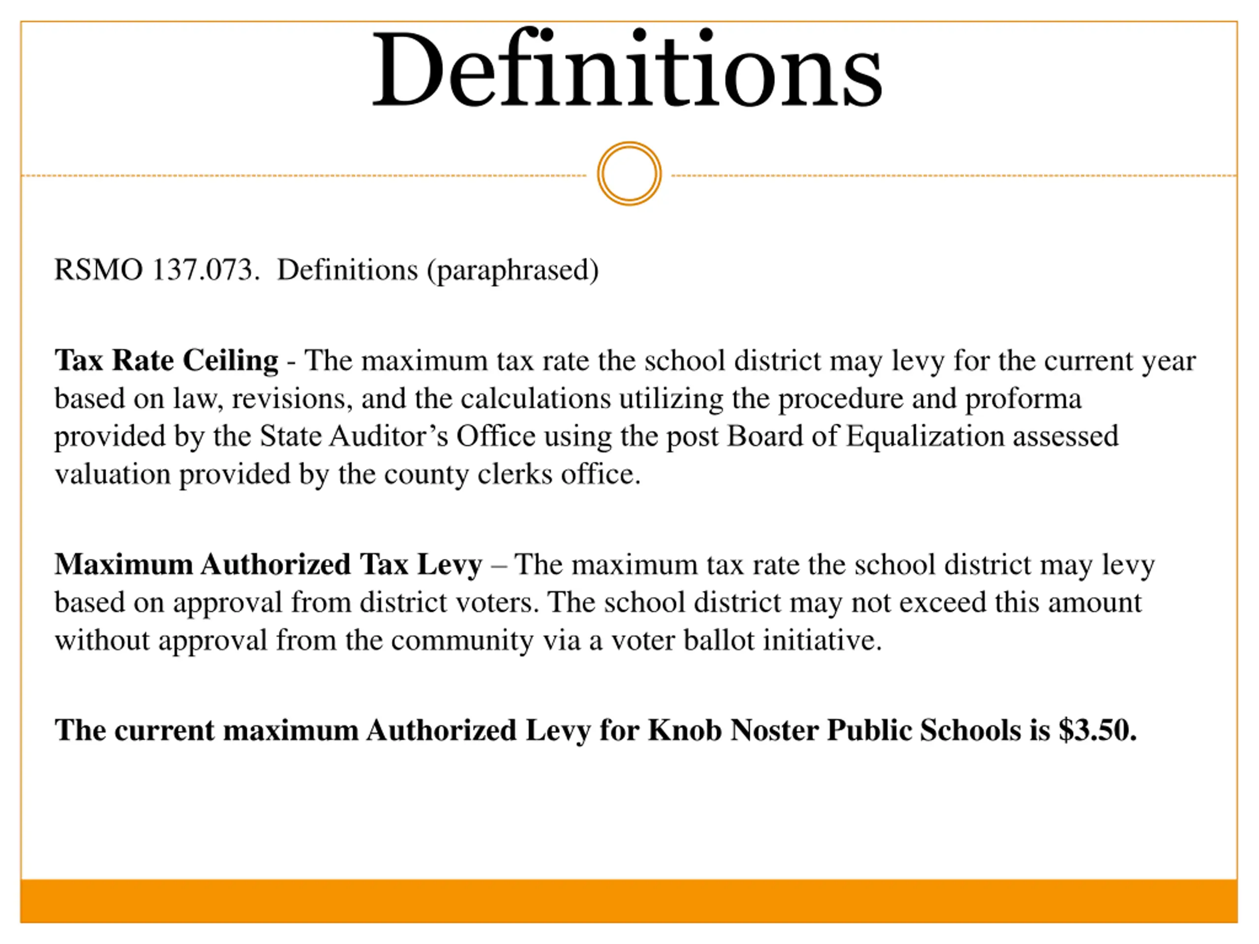 Definitions RSMO 137.073. Definitions (paraphrased) Tax Rate Ceiling - The maximum tax rate the school district may levy for the current year based on law, revisions, and the calculations utilizing the procedure and proforma provided by the State Auditor s Office using the post Board of Equalization assessed valuation provided by the county clerks office. Maximum Authorized Tax Levy The maximum tax rate the school district may levy based on approval from district voters. The school district may not exceed this amount without approval from the community via a voter ballot initiative. The current maximum Authorized Levy for Knob Noster Public Schools is $3.50.