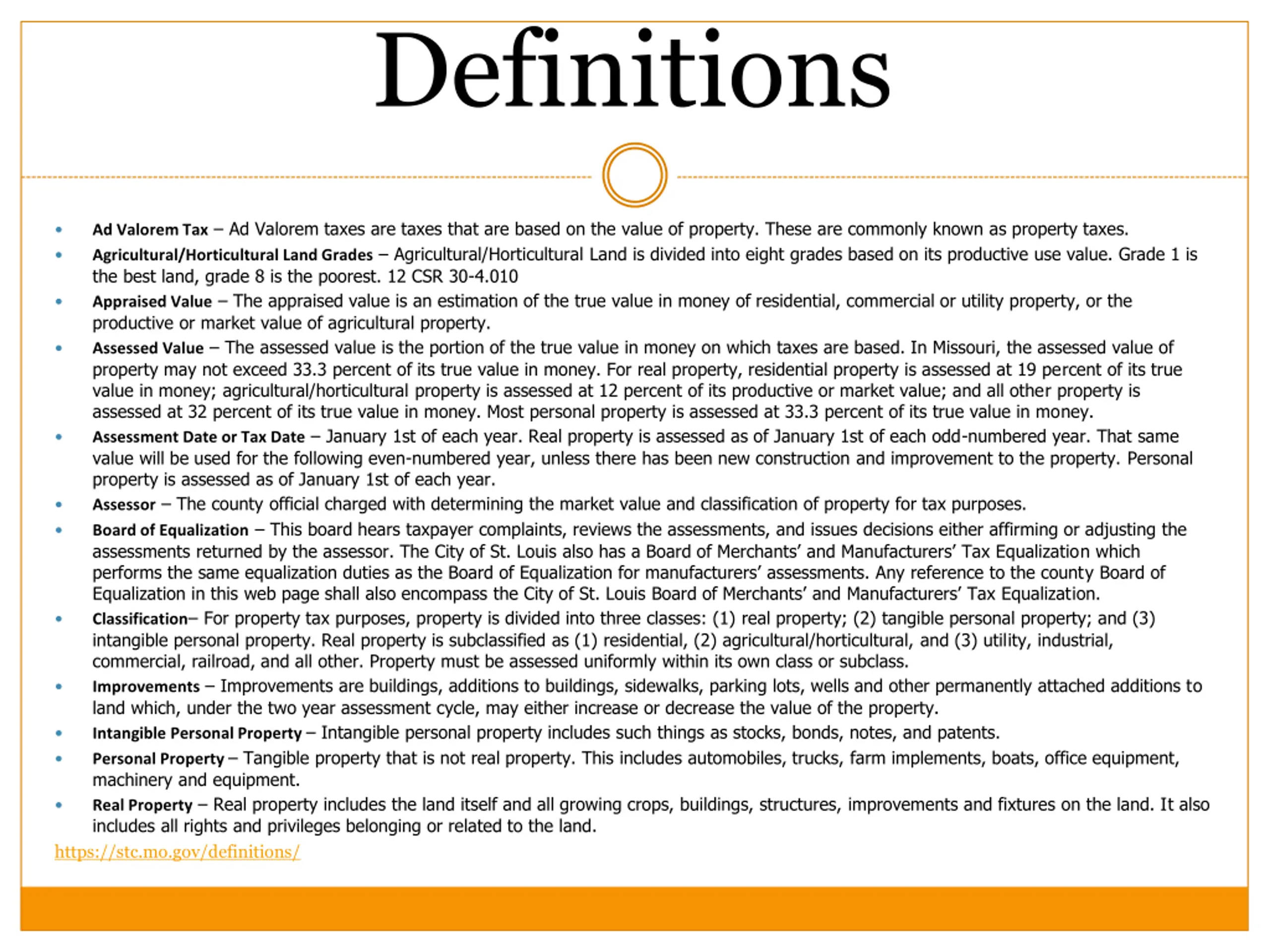 Definitions Ad Valorem Tax Ad Valorem taxes are taxes that are based on the value of property. These are commonly known as property taxes. Agricultural/Horticultural Land Grades Agricultural/Horticultural Land is divided into eight grades based on its productive use value. Grade 1 is the best land, grade 8 is the poorest. 12 CSR 30-4.010 Appraised Value The appraised value is an estimation of the true value in money of residential, commercial or utility property, or the productive or market value of agricultural property. Assessed Value The assessed value is the portion of the true value in money on which taxes are based. In Missouri, the assessed value of property may not exceed 33.3 percent of its true value in money. For real property, residential property is assessed at 19 percent of its true value in money; agricultural/horticultural property is assessed at 12 percent of its productive or market value; and all other property is assessed at 32 percent of its true value in money. Most personal property is assessed at 33.3 percent of its true value in money. Assessment Date or Tax Date January 1st of each year. Real property is assessed as of January 1st of each odd-numbered year. That same value will be used for the following even-numbered year, unless there has been new construction and improvement to the property. Personal property is assessed as of January 1st of each year. Assessor The county official charged with determining the market value and classification of property for tax purposes. Board of Equalization This board hears taxpayer complaints, reviews the assessments, and issues decisions either affirming or adjusting the assessments returned by the assessor. The City of St. Louis also has a Board of Merchants and Manufacturers Tax Equalization which performs the same equalization duties as the Board of Equalization for manufacturers assessments. Any reference to the county Board of Equalization in this web page shall also encompass the City of St. Louis Board of Merchants and Manufacturers Tax Equalization. Classification For property tax purposes, property is divided into three classes: (1) real property; (2) tangible personal property; and (3) intangible personal property. Real property is subclassified as (1) residential, (2) agricultural/horticultural, and (3) utility, industrial, commercial, railroad, and all other. Property must be assessed uniformly within its own class or subclass. Improvements Improvements are buildings, additions to buildings, sidewalks, parking lots, wells and other permanently attached additions to land which, under the two year assessment cycle, may either increase or decrease the value of the property. Intangible Personal Property Intangible personal property includes such things as stocks, bonds, notes, and patents. Personal Property Tangible property that is not real property. This includes automobiles, trucks, farm implements, boats, office equipment, machinery and equipment. Real Property Real property includes the land itself and all growing crops, buildings, structures, improvements and fixtures on the land. It also includes all rights and privileges belonging or related to the land. https://stc.mo.gov/definitions/
