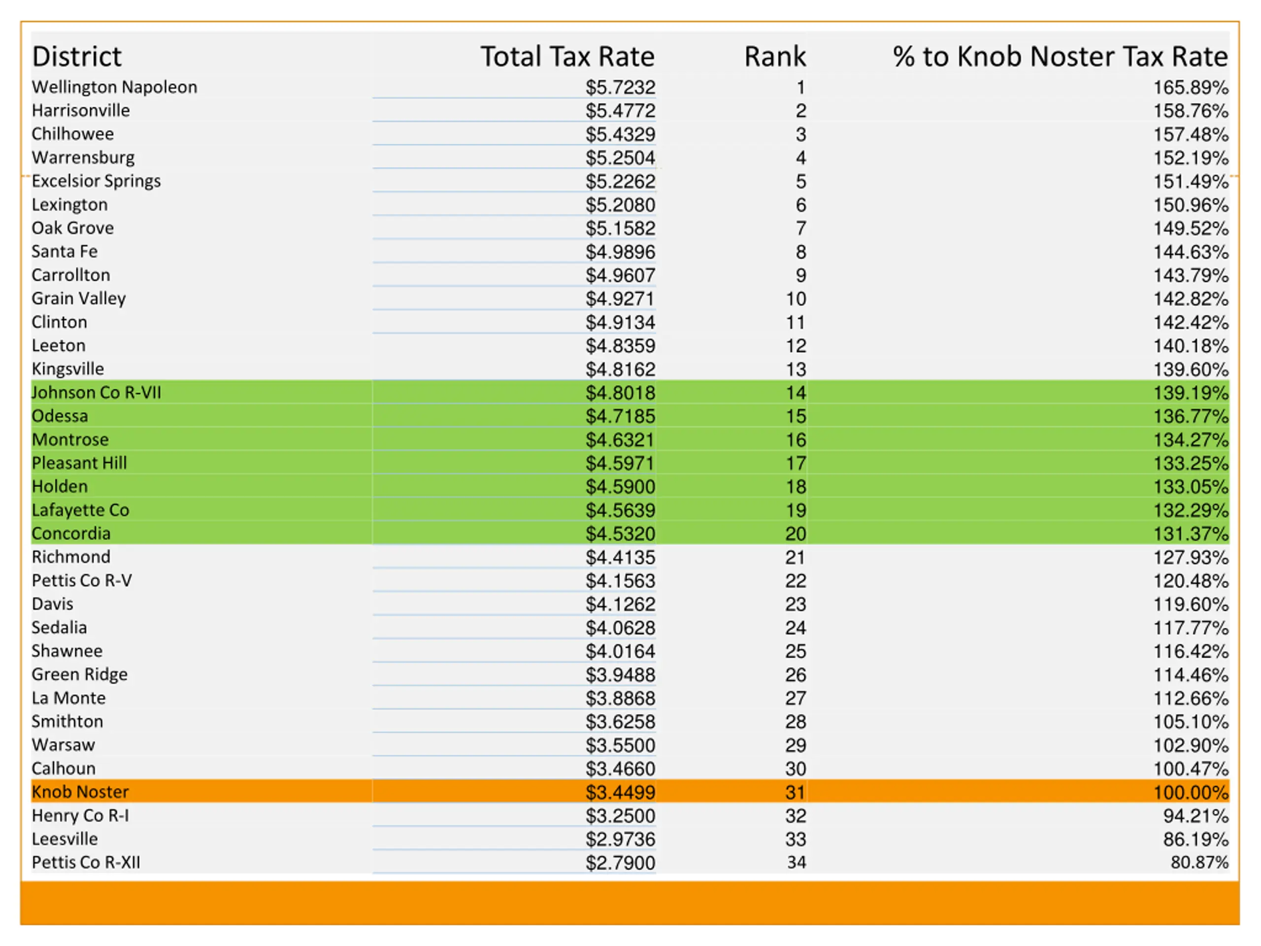District Wellington Napoleon Harrisonville Chilhowee Warrensburg Excelsior Springs Lexington Oak Grove Santa Fe Carrollton Grain Valley Clinton Leeton Kingsville Johnson Co R-VII Odessa Montrose Pleasant Hill Holden Lafayette Co Concordia Richmond Pettis Co R-V Davis Sedalia Shawnee Green Ridge La Monte Smithton Warsaw Calhoun Knob Noster Henry Co R-I Leesville Pettis Co R-XII Total Tax Rate Rank % to Knob Noster Tax Rate $5.7232 $5.4772 $5.4329 $5.2504 $5.2262 $5.2080 $5.1582 $4.9896 $4.9607 $4.9271 $4.9134 $4.8359 $4.8162 $4.8018 $4.7185 $4.6321 $4.5971 $4.5900 $4.5639 $4.5320 $4.4135 $4.1563 $4.1262 $4.0628 $4.0164 $3.9488 $3.8868 $3.6258 $3.5500 $3.4660 $3.4499 $3.2500 $2.9736 $2.7900 1 2 3 4 5 6 7 8 9 165.89% 158.76% 157.48% 152.19% 151.49% 150.96% 149.52% 144.63% 143.79% 142.82% 142.42% 140.18% 139.60% 139.19% 136.77% 134.27% 133.25% 133.05% 132.29% 131.37% 127.93% 120.48% 119.60% 117.77% 116.42% 114.46% 112.66% 105.10% 102.90% 100.47% 100.00% 94.21% 86.19% 80.87% 10 11 12 13 14 15 16 17 18 19 20 21 22 23 24 25 26 27 28 29 30 31 32 33 34