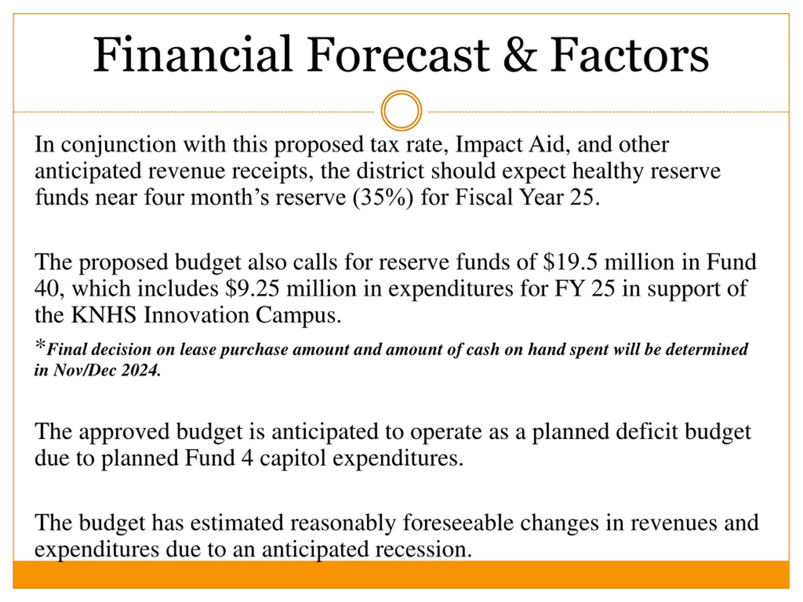 Financial Forecast & Factors In conjunction with this proposed tax rate, Impact Aid, and other anticipated revenue receipts, the district should expect healthy reserve funds near four month s reserve (35%) for Fiscal Year 25. The proposed budget also calls for reserve funds of $19.5 million in Fund 40, which includes $9.25 million in expenditures for FY 25 in support of the KNHS Innovation Campus. *Final decision on lease purchase amount and amount of cash on hand spent will be determined in Nov/Dec 2024. The approved budget is anticipated to operate as a planned deficit budget due to planned Fund 4 capitol expenditures. The budget has estimated reasonably foreseeable changes in revenues and expenditures due to an anticipated recession.