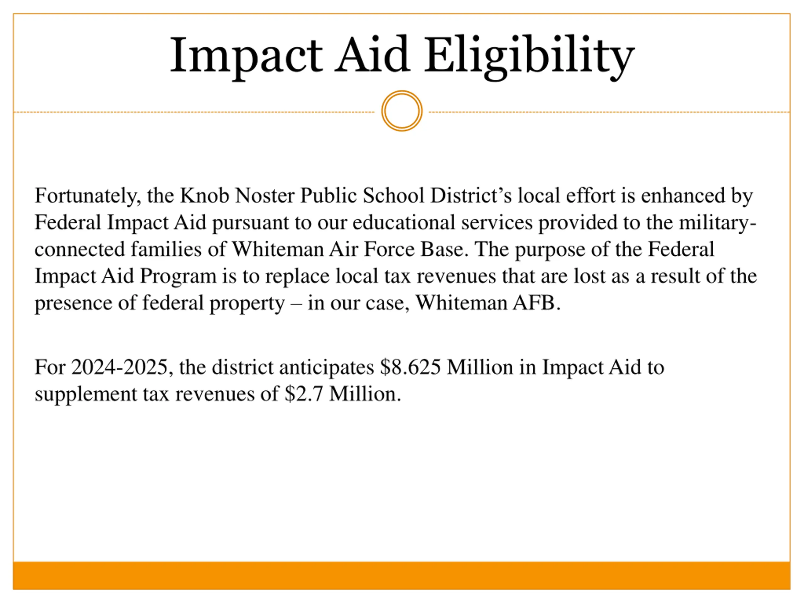 Impact Aid Eligibility Fortunately, the Knob Noster Public School District s local effort is enhanced by Federal Impact Aid pursuant to our educational services provided to the military- connected families of Whiteman Air Force Base. The purpose of the Federal Impact Aid Program is to replace local tax revenues that are lost as a result of the presence of federal property in our case, Whiteman AFB. For 2024-2025, the district anticipates $8.625 Million in Impact Aid to supplement tax revenues of $2.7 Million.