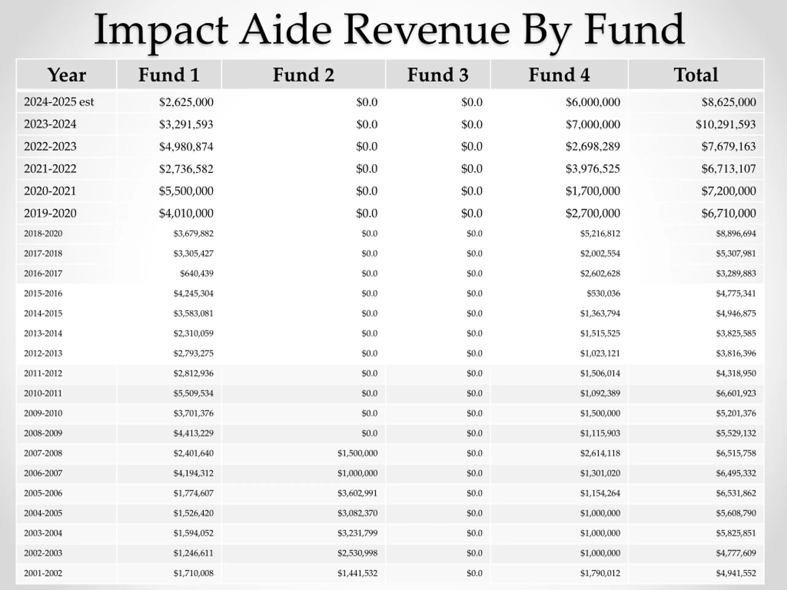 Impact Aide Revenue By Fund Year Fund 1 Fund 2 Fund 3 Fund 4 Total $2,625,000 $0.0 $0.0 $6,000,000 $8,625,000 2024-2025 est $3,291,593 $0.0 $0.0 $7,000,000 $10,291,593 2023-2024 $2,698,289 $7,679,163 $4,980,874 2022-2023 $0.0 $0.0 $3,976,525 $6,713,107 $2,736,582 2021-2022 $0.0 $0.0 2020-2021 $5,500,000 $0.0 $0.0 $1,700,000 $7,200,000 2019-2020 $4,010,000 $0.0 $0.0 $2,700,000 $6,710,000 2018-2020 $3,679,882 $0.0 $0.0 $5,216,812 $8,896,694 2017-2018 $3,305,427 $0.0 $0.0 $2,002,554 $5,307,981 2016-2017 $640,439 $0.0 $0.0 $2,602,628 $3,289,883 2015-2016 $4,245,304 $0.0 $0.0 $530,036 $4,775,341 2014-2015 $3,583,081 $0.0 $0.0 $1,363,794 $4,946,875 2013-2014 $2,310,059 $0.0 $0.0 $1,515,525 $3,825,585 2012-2013 $2,793,275 $0.0 $0.0 $1,023,121 $3,816,396 2011-2012 $2,812,936 $0.0 $0.0 $1,506,014 $4,318,950 2010-2011 $5,509,534 $0.0 $0.0 $1,092,389 $6,601,923 2009-2010 $3,701,376 $0.0 $0.0 $1,500,000 $5,201,376 2008-2009 $4,413,229 $0.0 $0.0 $1,115,903 $5,529,132 2007-2008 $2,401,640 $1,500,000 $0.0 $2,614,118 $6,515,758 2006-2007 $4,194,312 $1,000,000 $0.0 $1,301,020 $6,495,332 2005-2006 $1,774,607 $3,602,991 $0.0 $1,154,264 $6,531,862 2004-2005 $1,526,420 $3,082,370 $0.0 $1,000,000 $5,608,790 2003-2004 $1,594,052 $3,231,799 $0.0 $1,000,000 $5,825,851 2002-2003 $1,246,611 $2,530,998 $0.0 $1,000,000 $4,777,609 2001-2002 $1,710,008 $1,441,532 $0.0 $1,790,012 $4,941,552