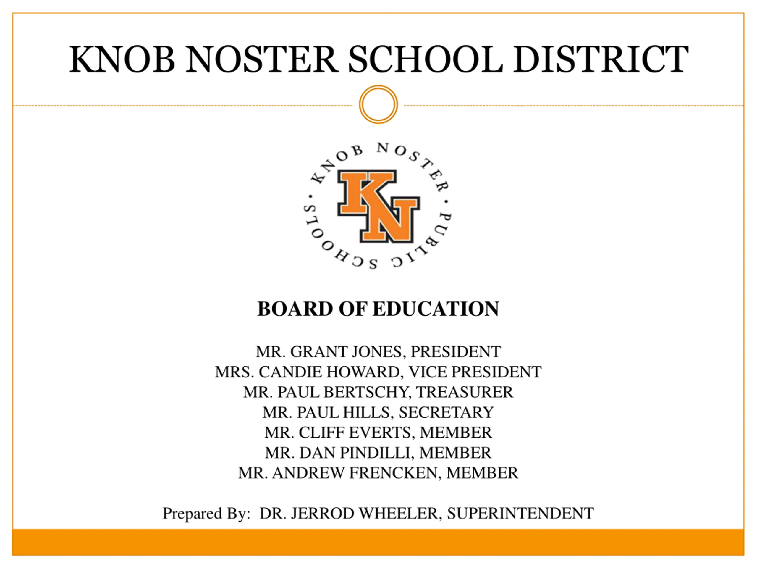 KNOB NOSTER SCHOOL DISTRICT BOARD OF EDUCATION MR. GRANT JONES, PRESIDENT MRS. CANDIE HOWARD, VICE PRESIDENT MR. PAUL BERTSCHY, TREASURER MR. PAUL HILLS, SECRETARY MR. CLIFF EVERTS, MEMBER MR. DAN PINDILLI, MEMBER MR. ANDREW FRENCKEN, MEMBER Prepared By: DR. JERROD WHEELER, SUPERINTENDENT