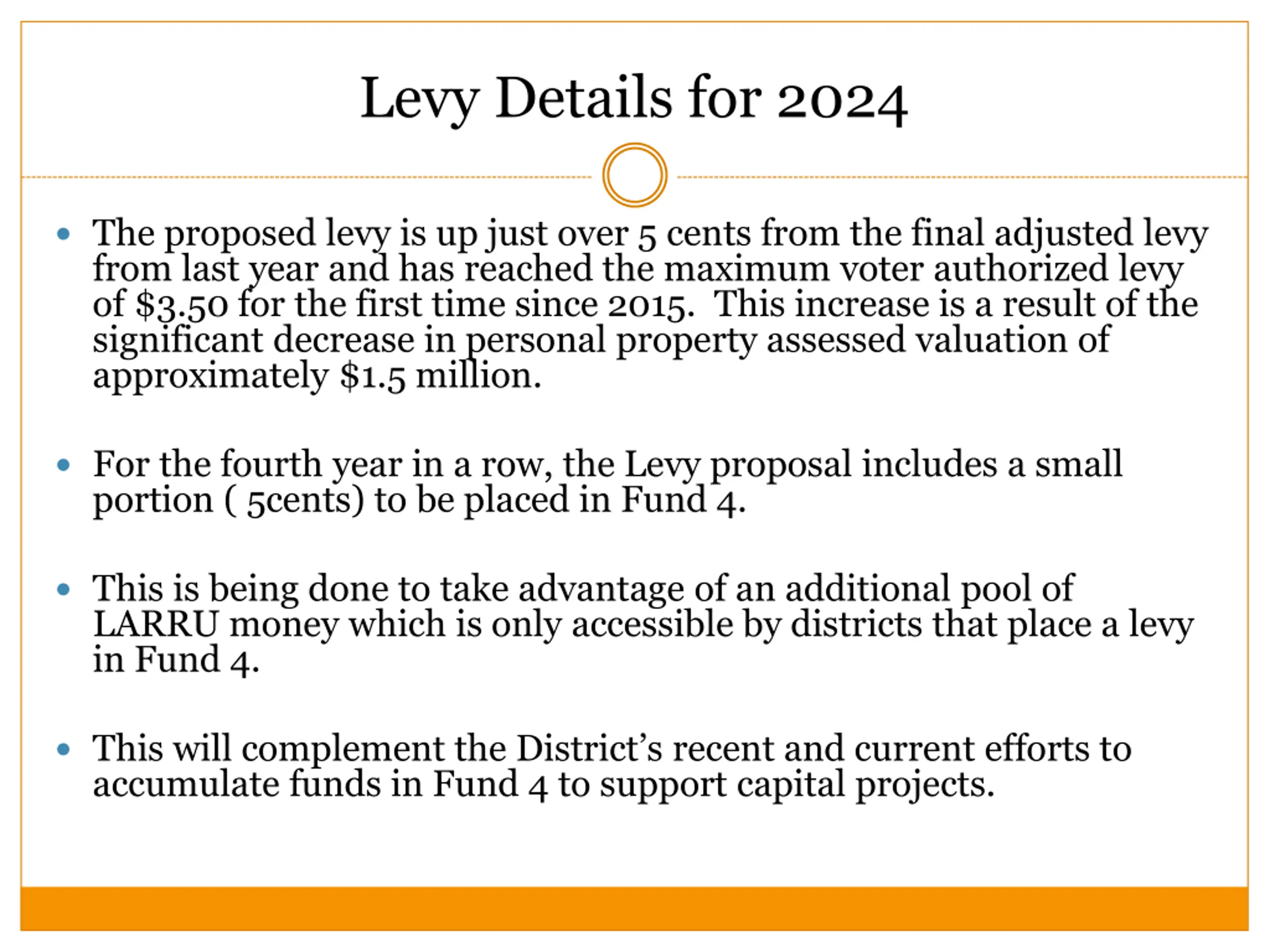 Levy Details for 2024 The proposed levy is up just over 5 cents from the final adjusted levy from last year and has reached the maximum voter authorized levy of $3.50 for the first time since 2015. This increase is a result of the significant decrease in personal property assessed valuation of approximately $1.5 million. For the fourth year in a row, the Levy proposal includes a small portion ( 5cents) to be placed in Fund 4. This is being done to take advantage of an additional pool of LARRU money which is only accessible by districts that place a levy in Fund 4. This will complement the District s recent and current efforts to accumulate funds in Fund 4 to support capital projects.