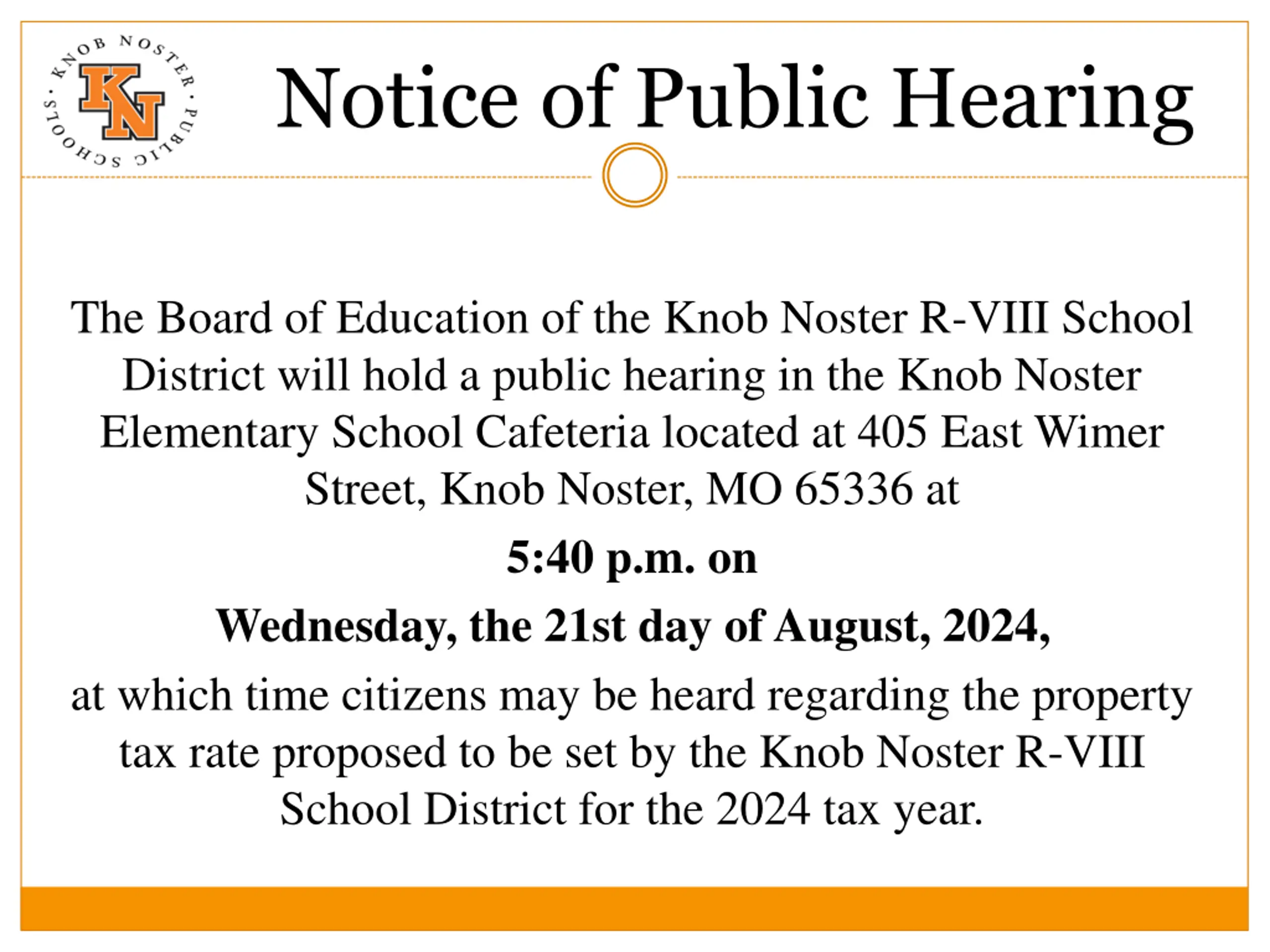 Notice of Public Hearing The Board of Education of the Knob Noster R-VIII School District will hold a public hearing in the Knob Noster Elementary School Cafeteria located at 405 East Wimer Street, Knob Noster, MO 65336 at 5:40 p.m. on Wednesday, the 21st day of August, 2024, at which time citizens may be heard regarding the property tax rate proposed to be set by the Knob Noster R-VIII School District for the 2024 tax year.