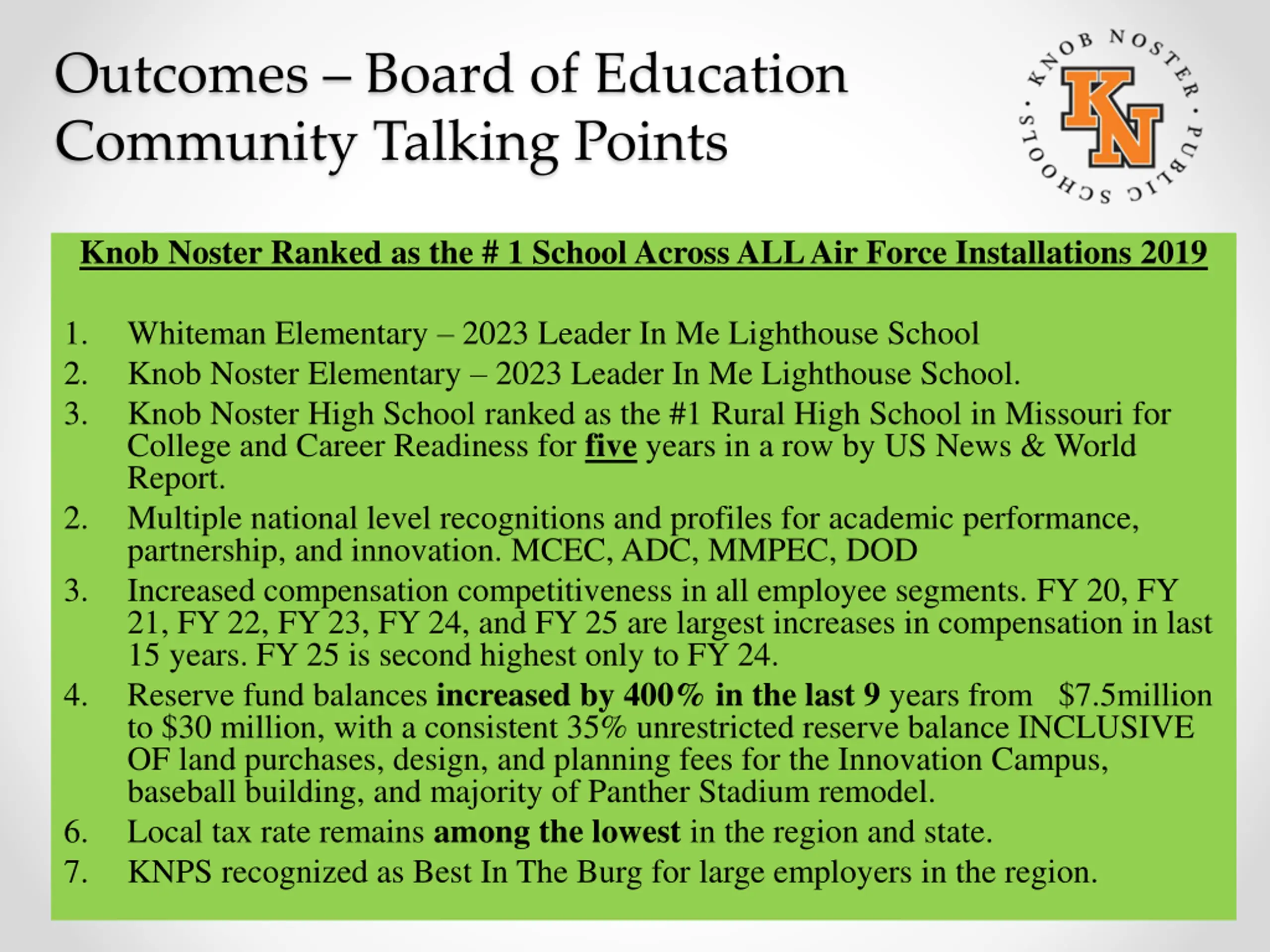 Outcomes Board of Education Community Talking Points Knob Noster Ranked as the # 1 School Across ALL Air Force Installations 2019 1. 2. 3. Whiteman Elementary 2023 Leader In Me Lighthouse School Knob Noster Elementary 2023 Leader In Me Lighthouse School. Knob Noster High School ranked as the #1 Rural High School in Missouri for College and Career Readiness for five years in a row by US News & World Report. Multiple national level recognitions and profiles for academic performance, partnership, and innovation. MCEC, ADC, MMPEC, DOD Increased compensation competitiveness in all employee segments. FY 20, FY 21, FY 22, FY 23, FY 24, and FY 25 are largest increases in compensation in last 15 years. FY 25 is second highest only to FY 24. Reserve fund balances increased by 400% in the last 9 years from $7.5million to $30 million, with a consistent 35% unrestricted reserve balance INCLUSIVE OF land purchases, design, and planning fees for the Innovation Campus, baseball building, and majority of Panther Stadium remodel. Local tax rate remains among the lowest in the region and state. KNPS recognized as Best In The Burg for large employers in the region. 2. 3. 4. 6. 7.