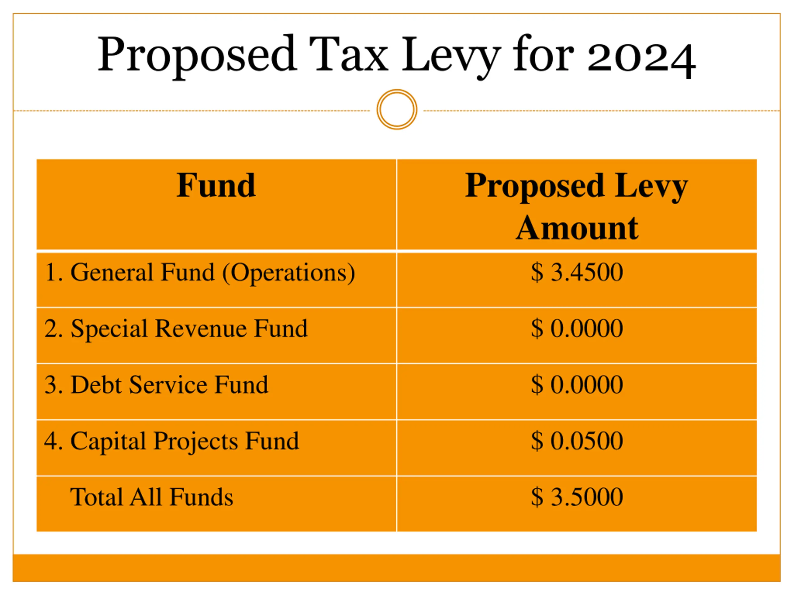 Proposed Tax Levy for 2024 Fund Proposed Levy Amount $ 3.4500 1. General Fund (Operations) 2. Special Revenue Fund $ 0.0000 3. Debt Service Fund $ 0.0000 4. Capital Projects Fund $ 0.0500 Total All Funds $ 3.5000