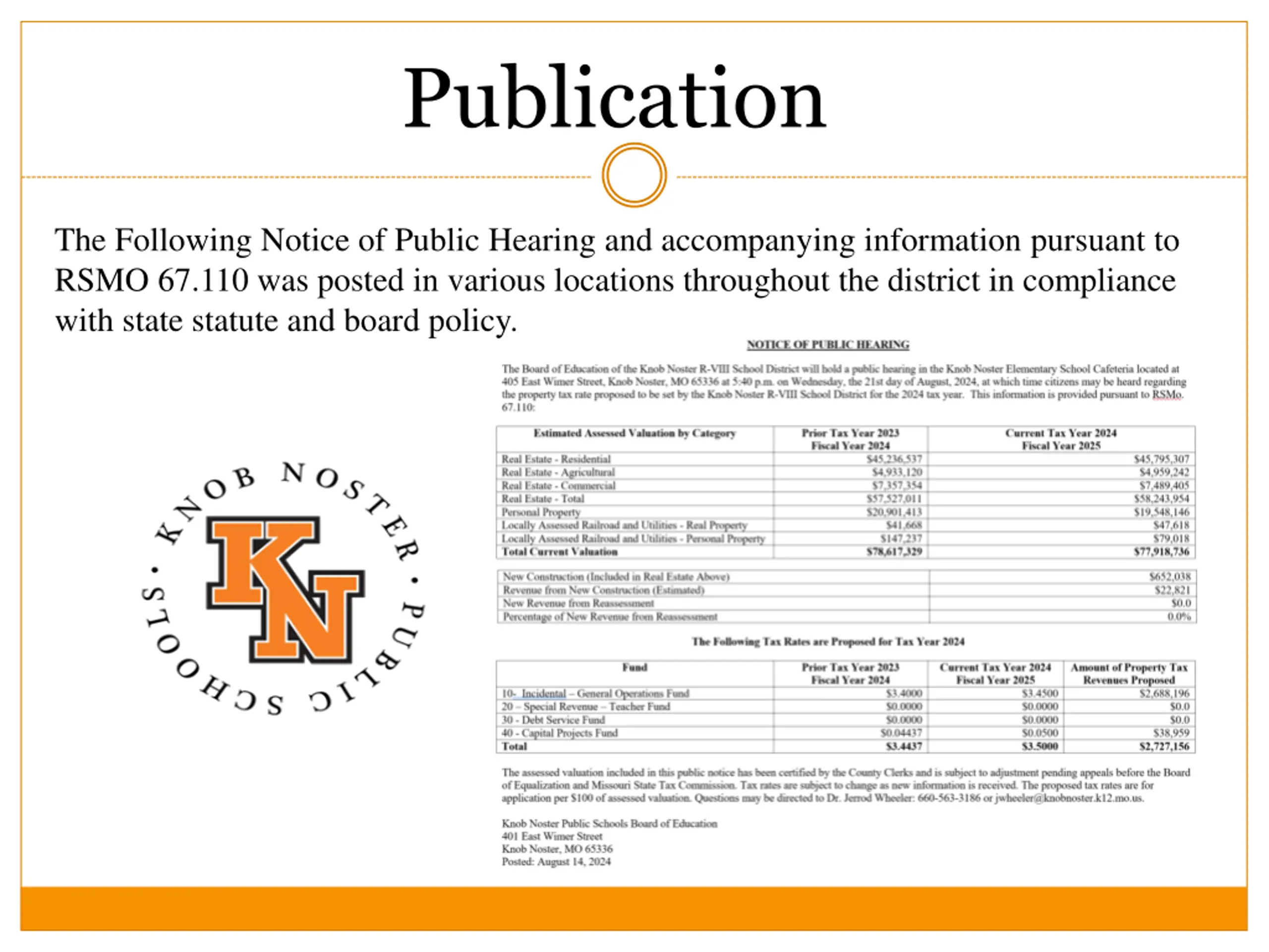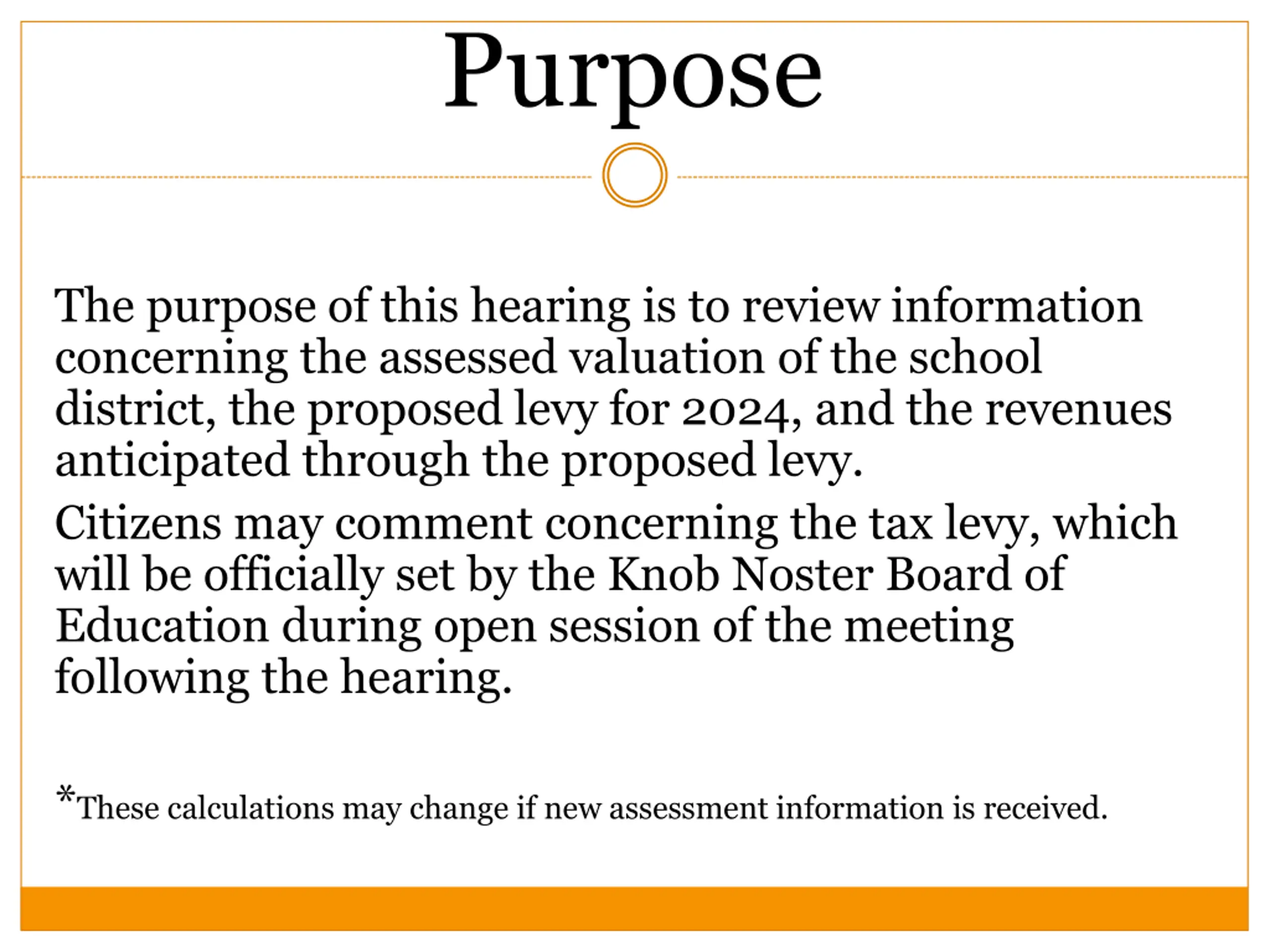 Purpose The purpose of this hearing is to review information concerning the assessed valuation of the school district, the proposed levy for 2024, and the revenues anticipated through the proposed levy. Citizens may comment concerning the tax levy, which will be officially set by the Knob Noster Board of Education during open session of the meeting following the hearing. *These calculations may change if new assessment information is received.