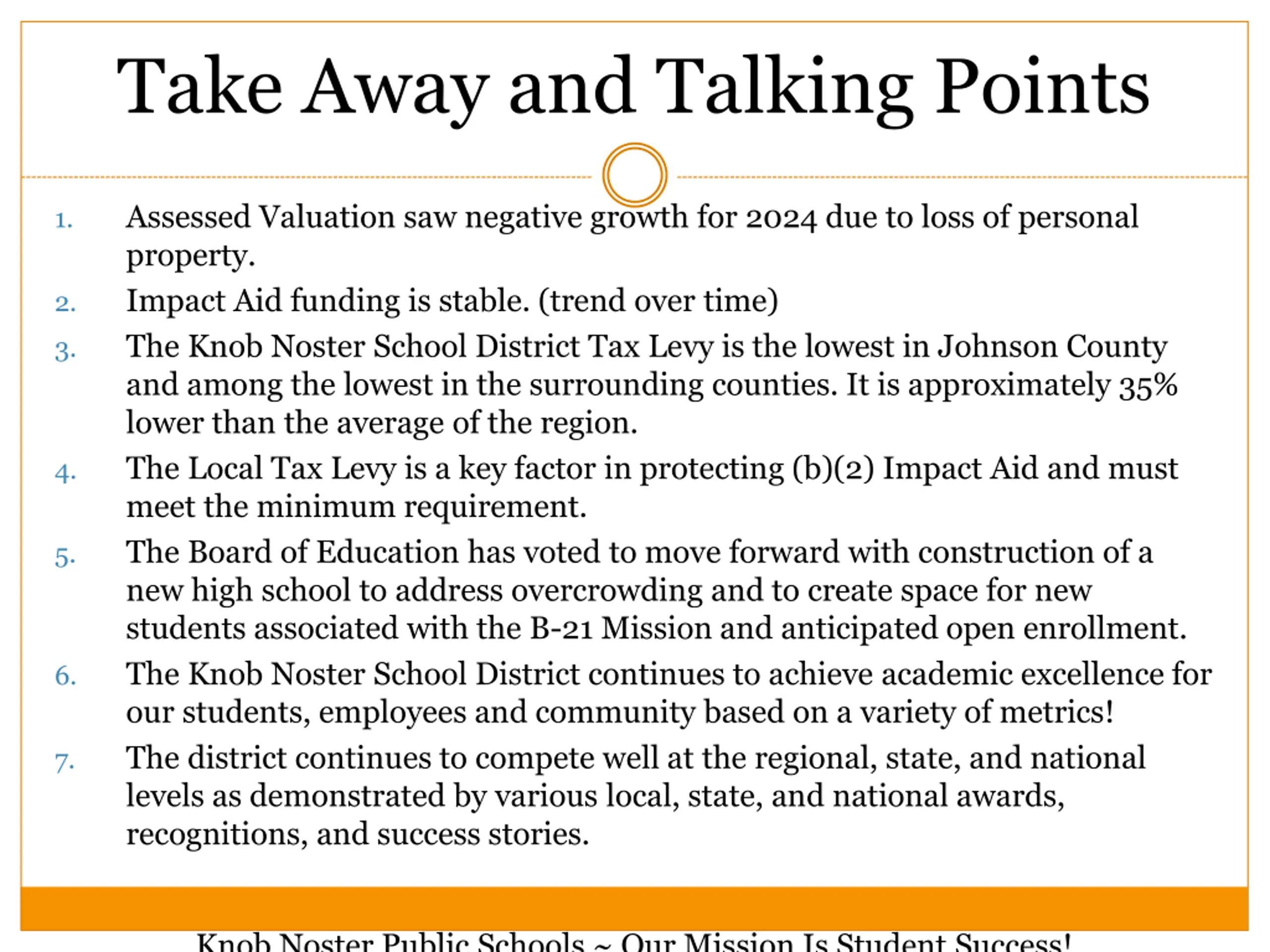Take Away and Talking Points Assessed Valuation saw negative growth for 2024 due to loss of personal property. Impact Aid funding is stable. (trend over time) The Knob Noster School District Tax Levy is the lowest in Johnson County and among the lowest in the surrounding counties. It is approximately 35% lower than the average of the region. The Local Tax Levy is a key factor in protecting (b)(2) Impact Aid and must meet the minimum requirement. The Board of Education has voted to move forward with construction of a new high school to address overcrowding and to create space for new students associated with the B-21 Mission and anticipated open enrollment. The Knob Noster School District continues to achieve academic excellence for our students, employees and community based on a variety of metrics! The district continues to compete well at the regional, state, and national levels as demonstrated by various local, state, and national awards, recognitions, and success stories. 1. 2. 3. 4. 5. 6. 7. Knob Noster Public Schools ~ Our Mission Is Student Success!