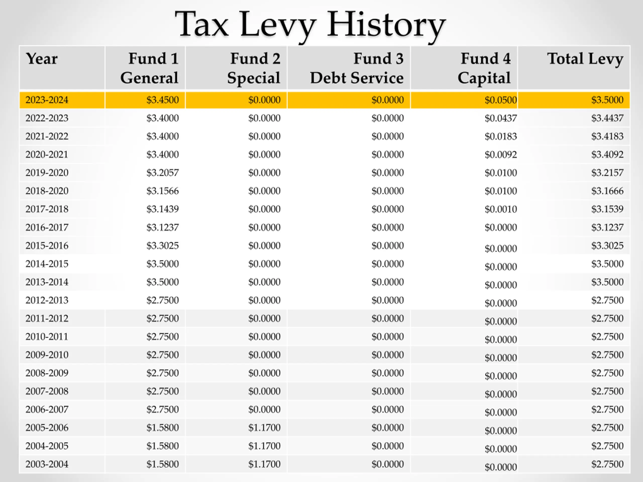 Tax Levy History Fund 1 General Special Year Fund 2 Fund 3 Fund 4 Capital Total Levy Debt Service 2023-2024 $3.4500 $0.0000 $0.0000 $3.5000 $0.0500 2022-2023 $3.4000 $0.0000 $0.0000 $3.4437 $0.0437 2021-2022 $3.4000 $0.0000 $0.0000 $3.4183 $0.0183 2020-2021 $3.4000 $0.0000 $0.0000 $3.4092 $0.0092 2019-2020 $3.2057 $0.0000 $0.0000 $3.2157 $0.0100 2018-2020 $3.1566 $0.0000 $0.0000 $3.1666 $0.0100 2017-2018 $3.1439 $0.0000 $0.0000 $3.1539 $0.0010 2016-2017 $3.1237 $0.0000 $0.0000 $3.1237 $0.0000 2015-2016 $3.3025 $0.0000 $0.0000 $3.3025 $0.0000 2014-2015 $3.5000 $0.0000 $0.0000 $3.5000 $0.0000 2013-2014 $3.5000 $0.0000 $0.0000 $3.5000 $0.0000 2012-2013 $2.7500 $0.0000 $0.0000 $2.7500 $0.0000 2011-2012 $2.7500 $0.0000 $0.0000 $2.7500 $0.0000 2010-2011 $2.7500 $0.0000 $0.0000 $2.7500 $0.0000 2009-2010 $2.7500 $0.0000 $0.0000 $2.7500 $0.0000 2008-2009 $2.7500 $0.0000 $0.0000 $2.7500 $0.0000 2007-2008 $2.7500 $0.0000 $0.0000 $2.7500 $0.0000 2006-2007 $2.7500 $0.0000 $0.0000 $2.7500 $0.0000 2005-2006 $1.5800 $1.1700 $0.0000 $2.7500 $0.0000 2004-2005 $1.5800 $1.1700 $0.0000 $2.7500 $0.0000 2003-2004 $1.5800 $1.1700 $0.0000 $2.7500 $0.0000