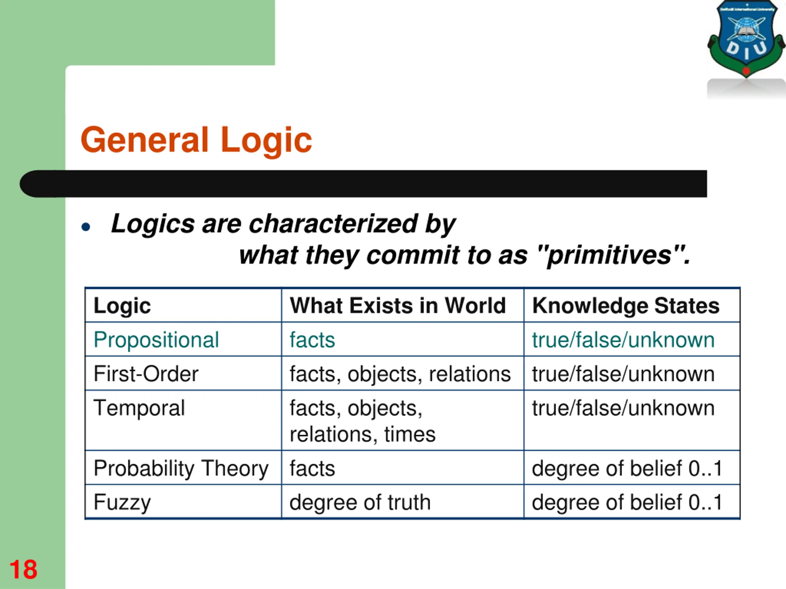 General Logic Logics are characterized by what they commit to as "primitives". Logic Propositional First-Order Temporal What Exists in World facts facts, objects, relations facts, objects, relations, times facts degree of truth Knowledge States true/false/unknown true/false/unknown true/false/unknown Probability Theory Fuzzy degree of belief 0..1 degree of belief 0..1 18