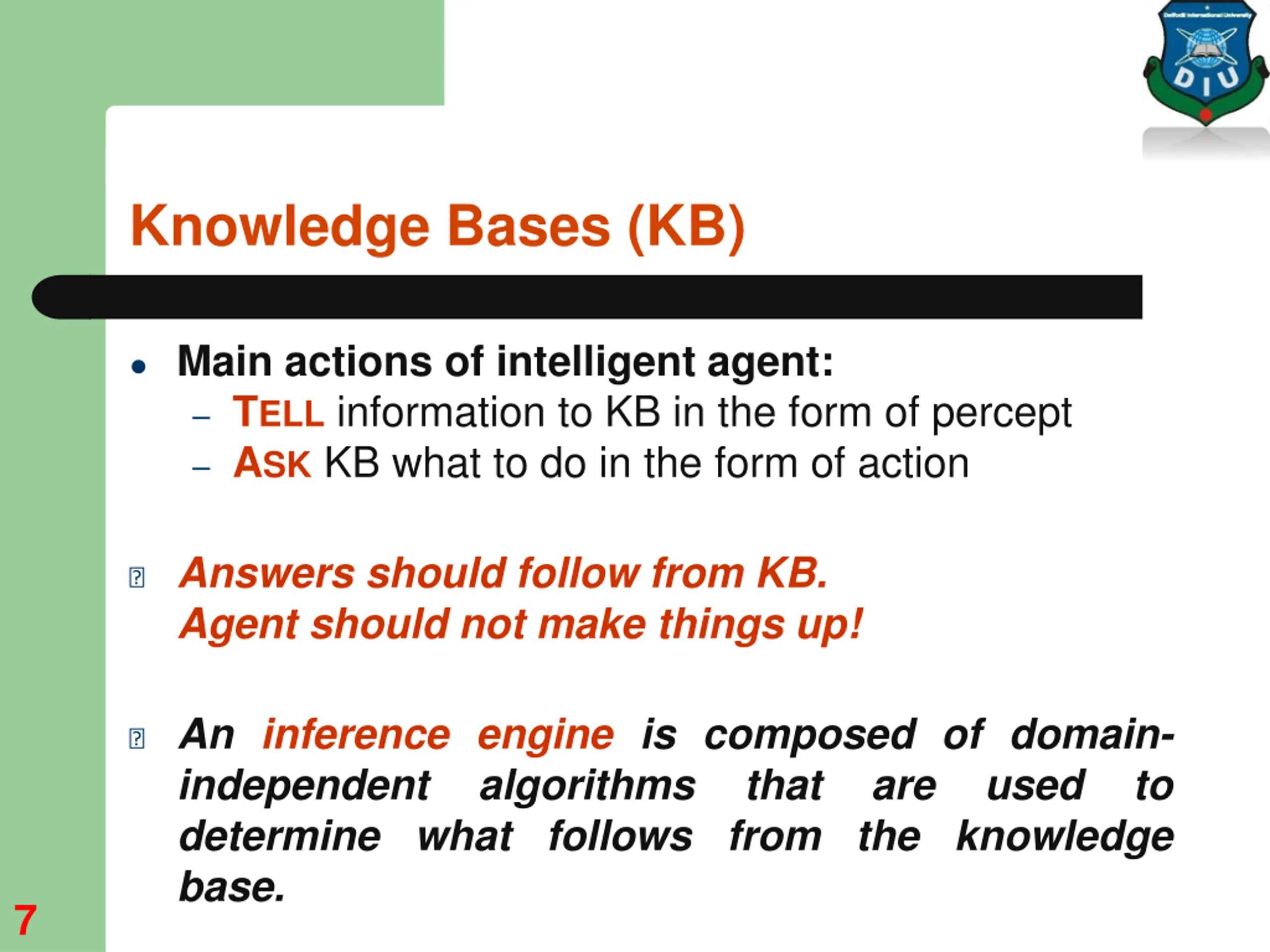 Knowledge Bases (KB) ? A knowledge base: contains the domain-specific content for an agent is a set of representations of facts about the world ? is a set of sentences in a formal language Building the KB: learning: agent discovers what it knows telling: agent is given what it knows (declarative) 6