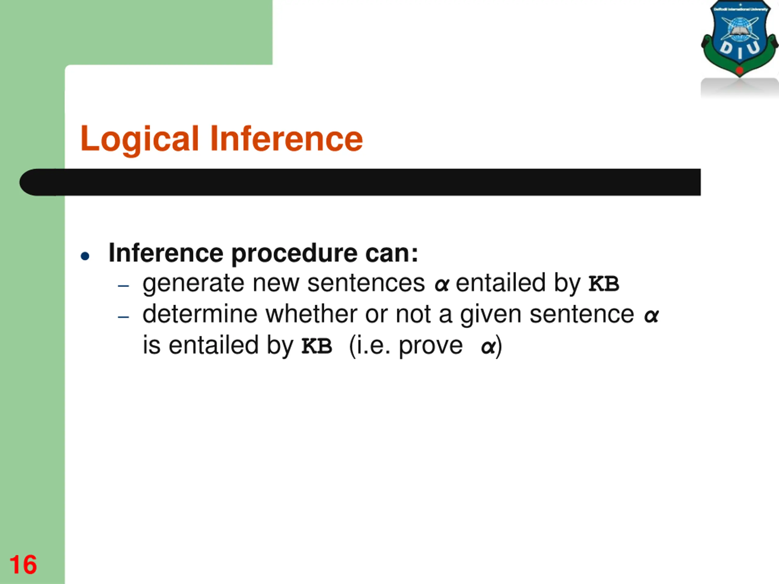 Logical Inference Inference procedure can: generate new sentences entailed by KB determine whether or not a given sentence is entailed by KB (i.e. prove ) 16