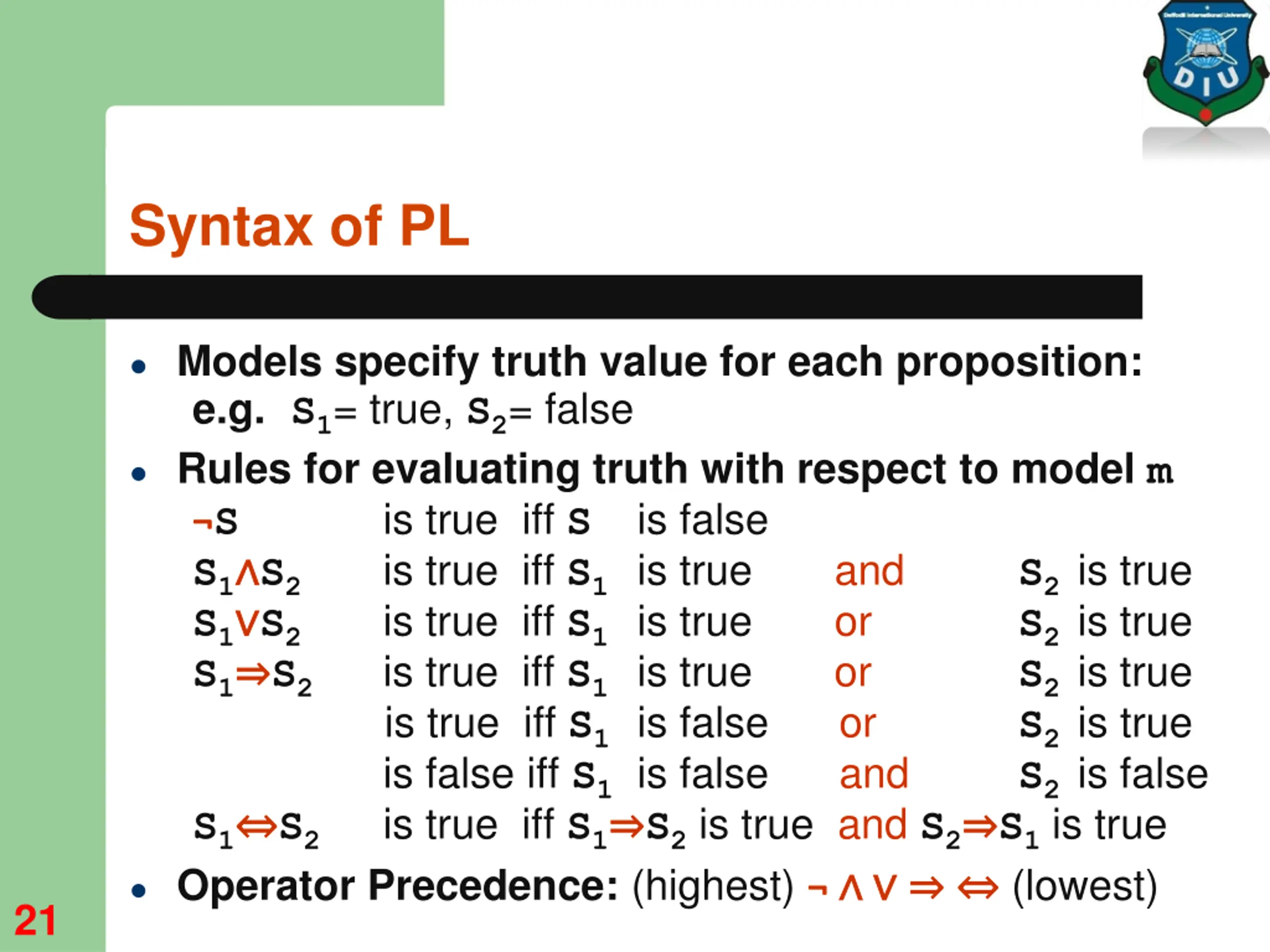 Syntax of PL Models specify truth value for each proposition: e.g. S1= true, S2= false Rules for evaluating truth with respect to model m S is true iff S is false S1 S2 is true iff S1is true S1 S2 is true iff S1is true S1 S2 is true iff S1is true or is true iff S1is false or is false iff S1is false and S1 S2 is true iff S1 S2is true and S2 S1is true Operator Precedence: (highest) and or S2 is true S2 is true S2 is true S2 is true S2 is false (lowest) 21