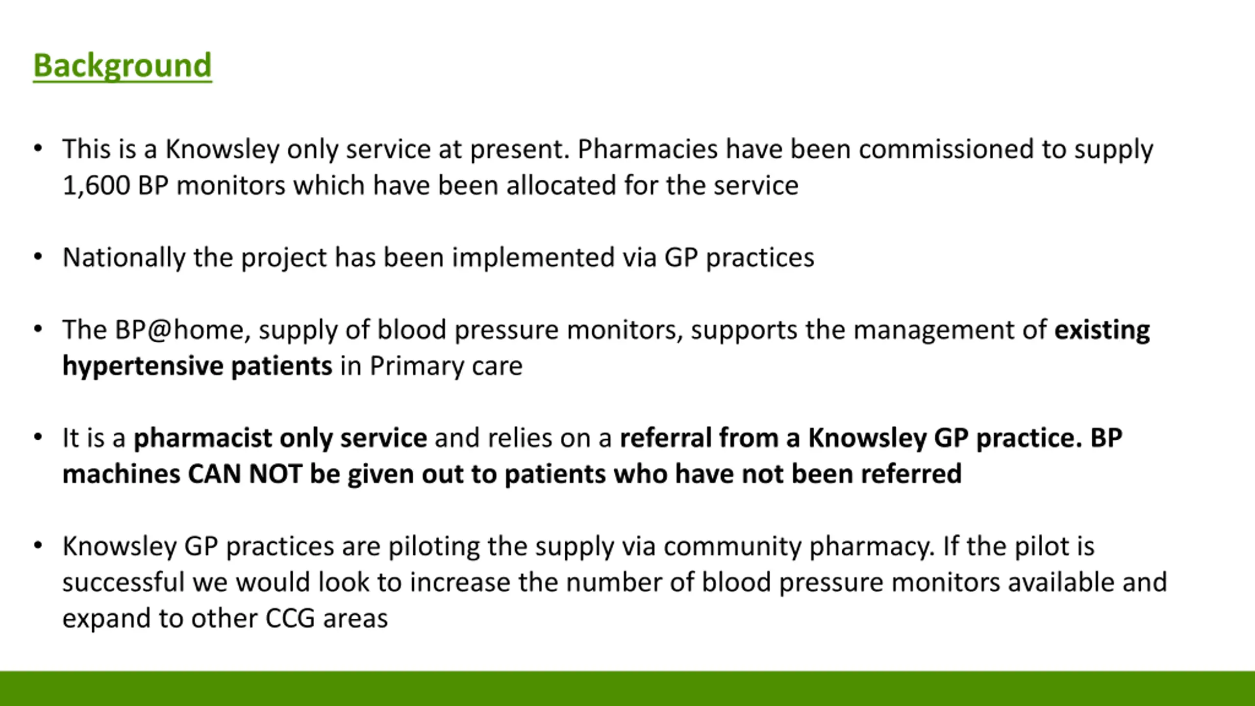 Background This is a Knowsley only service at present. Pharmacies have been commissioned to supply 1,600 BP monitors which have been allocated for the service Nationally the project has been implemented via GP practices The BP@home, supply of blood pressure monitors, supports the management of existing hypertensive patients in Primary care It is a pharmacist only service and relies on a referral from a Knowsley GP practice. BP machines CAN NOT be given out to patients who have not been referred Knowsley GP practices are piloting the supply via community pharmacy. If the pilot is successful we would look to increase the number of blood pressure monitors available and expand to other CCG areas