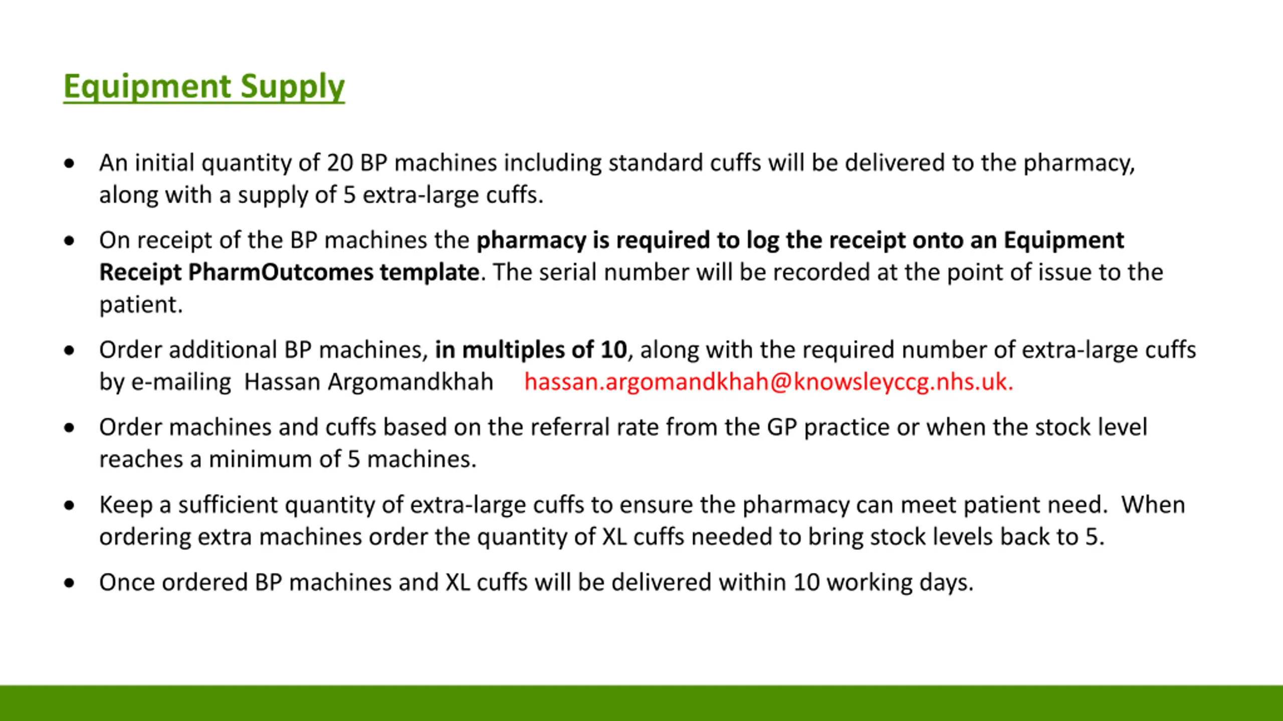 Equipment Supply An initial quantity of 20 BP machines including standard cuffs will be delivered to the pharmacy, along with a supply of 5 extra-large cuffs. On receipt of the BP machines the pharmacy is required to log the receipt onto an Equipment Receipt PharmOutcomes template. The serial number will be recorded at the point of issue to the patient. Order additional BP machines, in multiples of 10, along with the required number of extra-large cuffs by e-mailing Hassan Argomandkhah hassan.argomandkhah@knowsleyccg.nhs.uk. Order machines and cuffs based on the referral rate from the GP practice or when the stock level reaches a minimum of 5 machines. Keep a sufficient quantity of extra-large cuffs to ensure the pharmacy can meet patient need. When ordering extra machines order the quantity of XL cuffs needed to bring stock levels back to 5. Once ordered BP machines and XL cuffs will be delivered within 10 working days.
