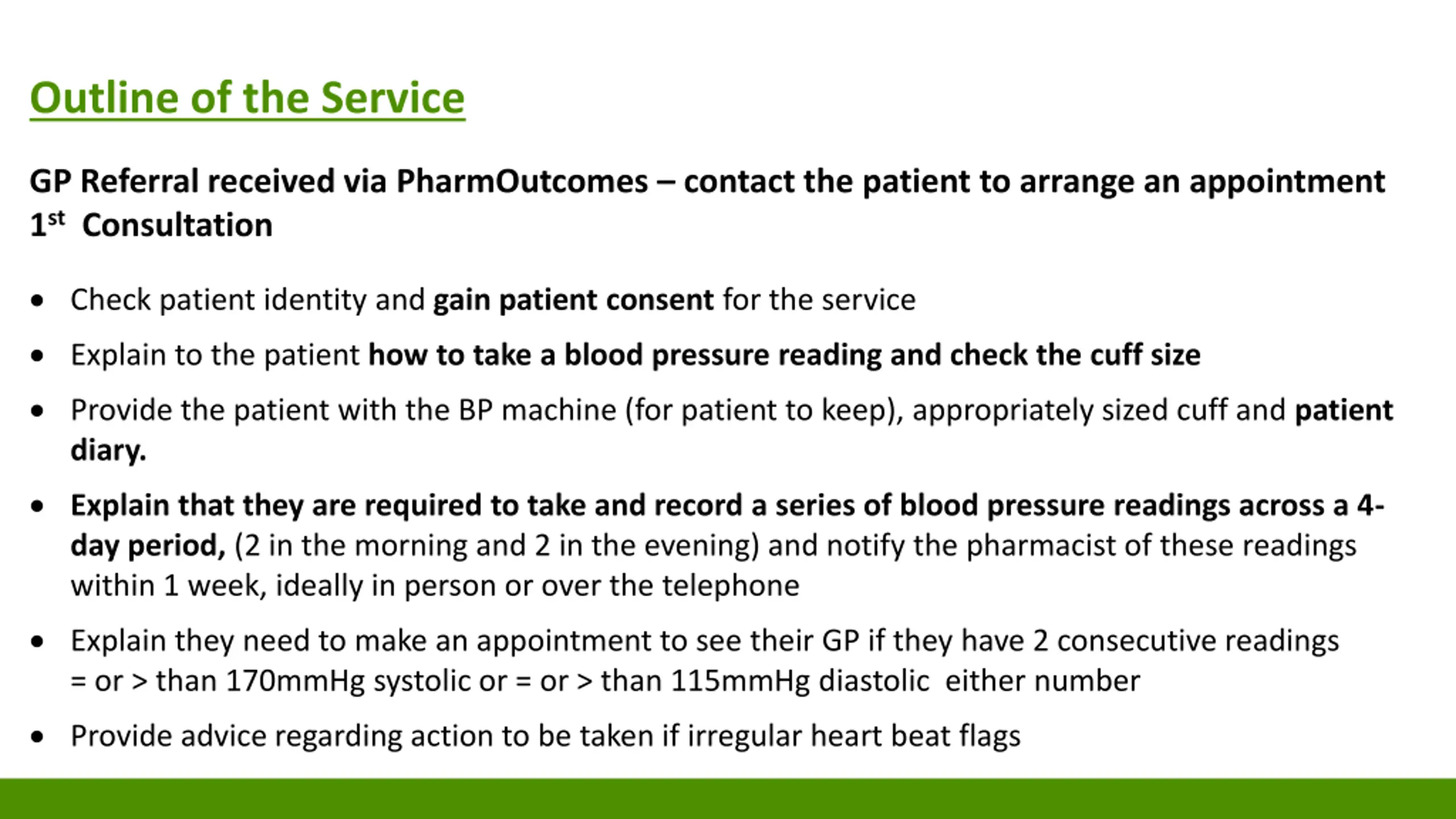 Outline of the Service GP Referral received via PharmOutcomes contact the patient to arrange an appointment 1st Consultation Check patient identity and gain patient consent for the service Explain to the patient how to take a blood pressure reading and check the cuff size Provide the patient with the BP machine (for patient to keep), appropriately sized cuff and patient diary. Explain that they are required to take and record a series of blood pressure readings across a 4- day period, (2 in the morning and 2 in the evening) and notify the pharmacist of these readings within 1 week, ideally in person or over the telephone Explain they need to make an appointment to see their GP if they have 2 consecutive readings = or > than 170mmHg systolic or = or > than 115mmHg diastolic either number Provide advice regarding action to be taken if irregular heart beat flags